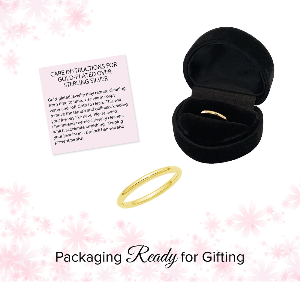 14K Gold-plated baby ring with a simple 2mm band - a classic!  This heirloom quality ring is made with sterling silver and then plated with 14K gold plating.  This makes a special keepsake baby gift or wonderful birthday gifts for toddlers, kids, children and due to popularity we have expanded up to size 8 for women!  Great pinky ring as well and comes in a beautiful black velvet heart-shaped box.