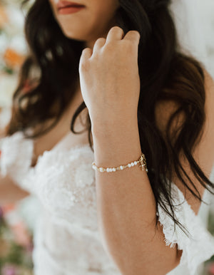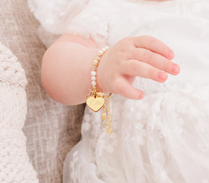 NEW! From our Timeless Collection, 14k gold-plated keepsake baptism gift "Baptism to Bride®" bracelet. This special keepsake will be a treasure that can be worn on her baptism day and then cherished again when she has her first communion, and becomes her "something old" on that special day when she becomes a bride. This is designed with 14K gold-plating (over .925 sterling silver) using all precious metals, high-quality freshwater pearls, high-end crystals, and is hand-beaded here in the USA.