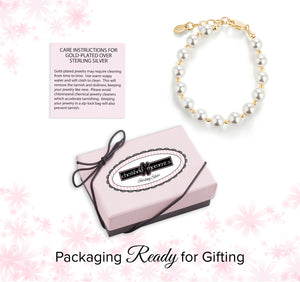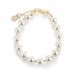 This precious little pearl bracelet designed with 14K gold (over sterling silver) and chunky high-end simulated pearls with sparkling gold accents. A wonderful gift for your baby, toddler, child or trendy little one. Celebrate these cherished moments with this keepsake she will treasure forever.