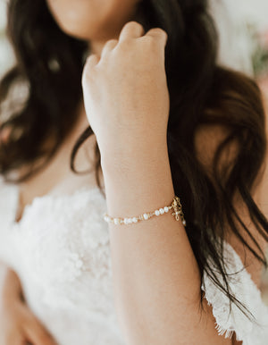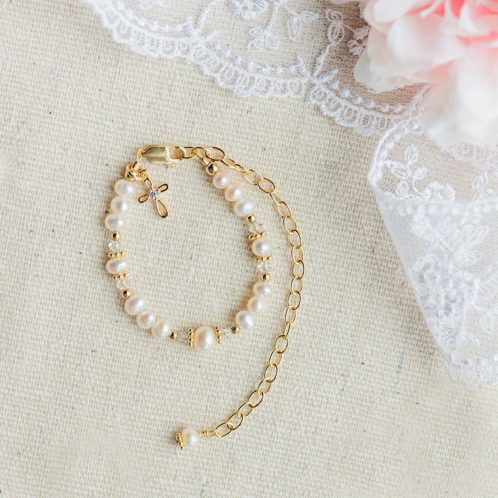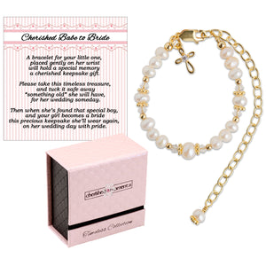 NEW! From our Timeless Collection, 14k gold-plated (over sterling silver) keepsake baby gift "Cherished Babe to Bride" cross bracelet. This special keepsake will be a treasure that can be worn at her christening, dedication, or baptism and becomes her "something old" on that special day when she becomes a bride. This is designed with all precious metals, high-quality freshwater pearls, high-end crystals, and is hand-beaded here in the USA.