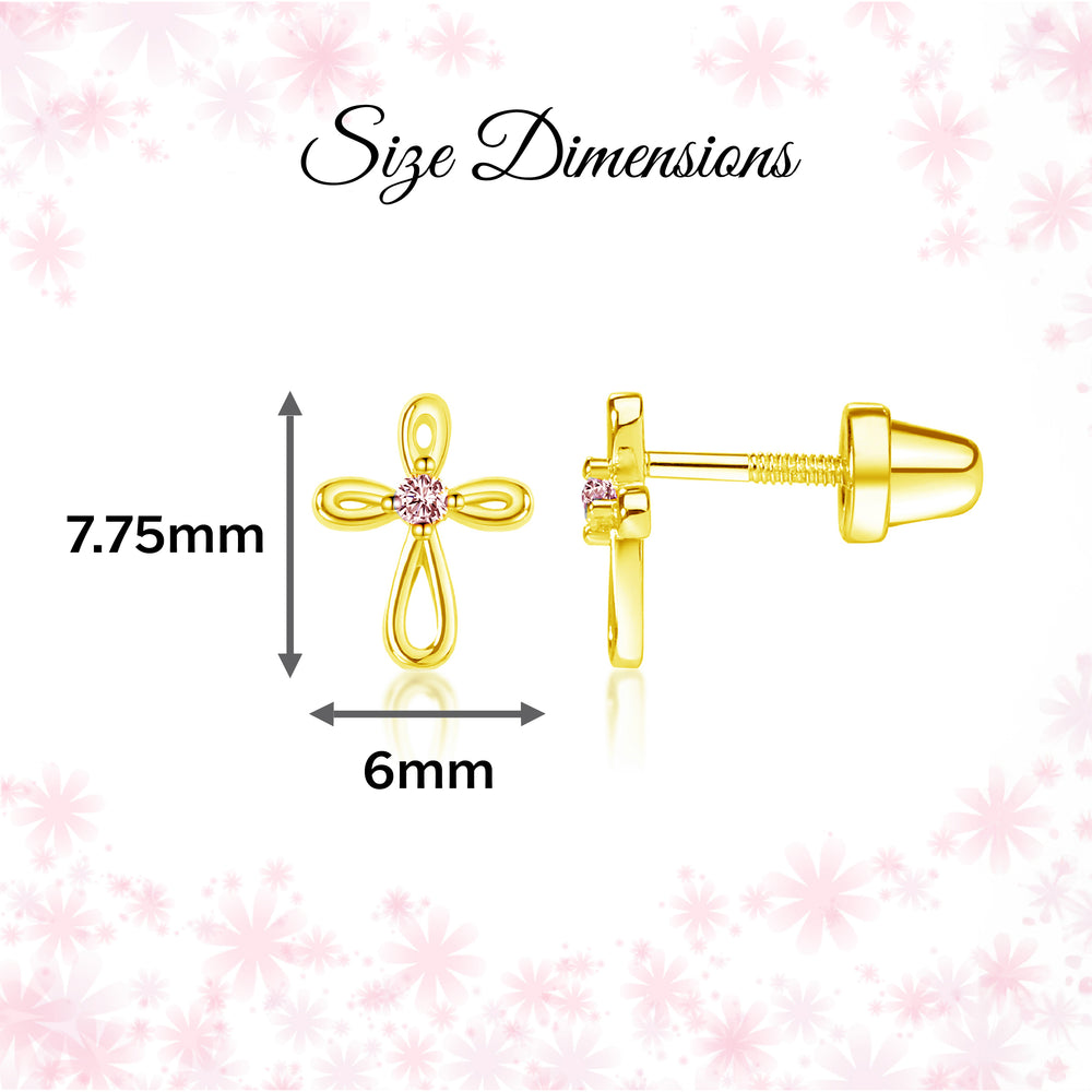 Children's 14K gold-plated (over sterling silver) infinity cross earrings for little girls with pink sparkling CZs.