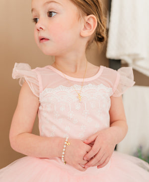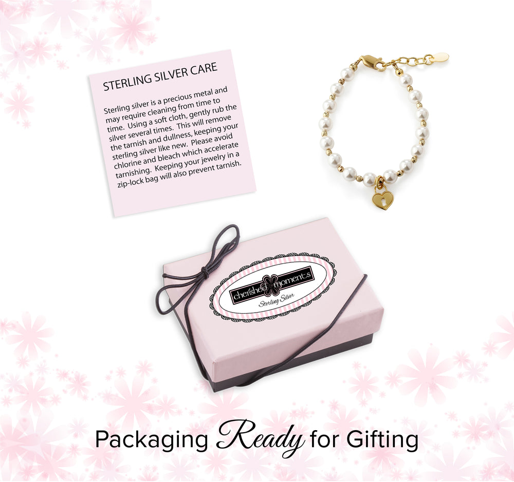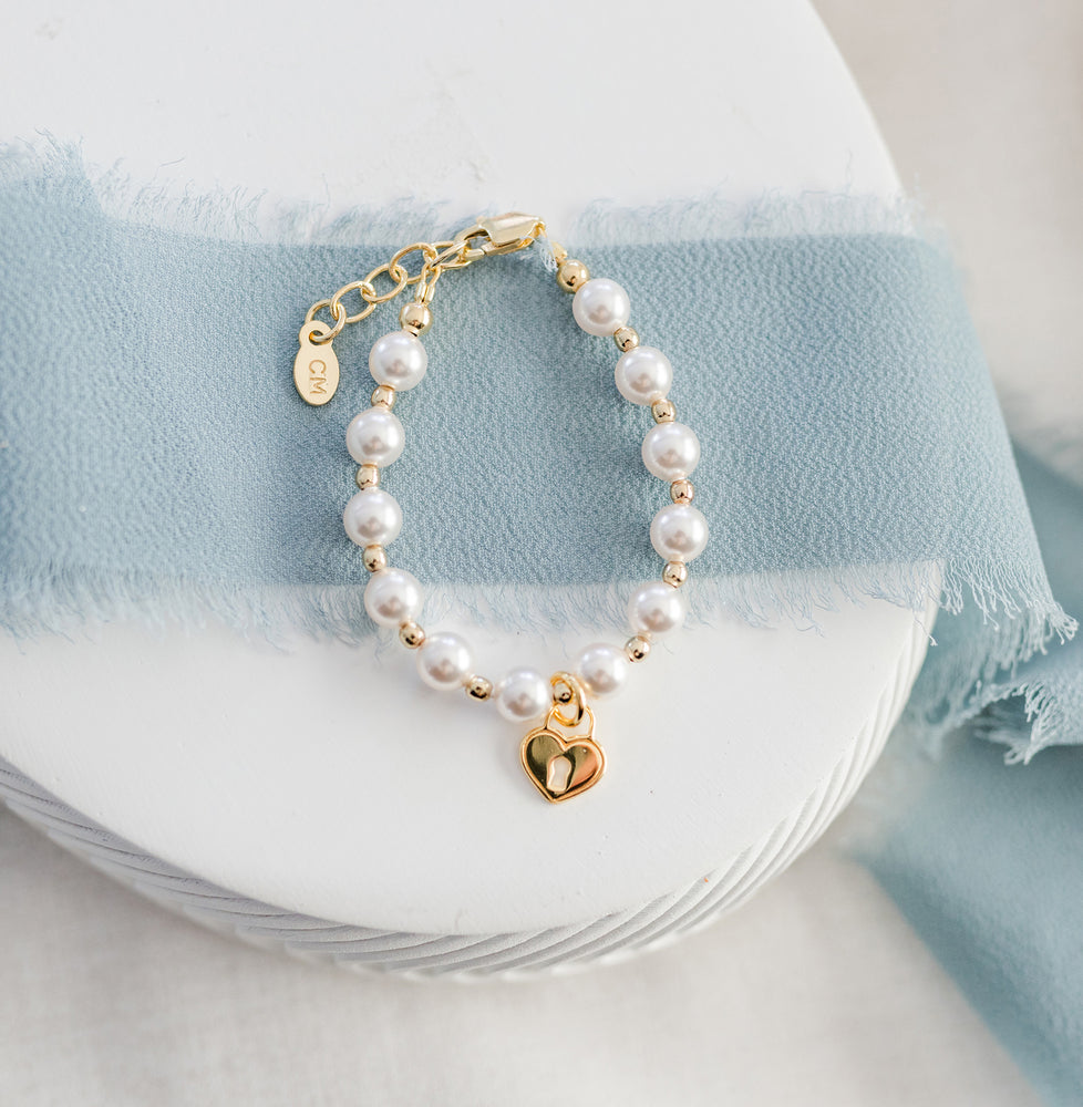 This precious little bracelet designed with 14K gold (over sterling silver) and high-end simulated pearls accented with a sweet little gold heart-shaped lock and sparkling gold accents. A wonderful gift for little girls with the heart lock symbolizing love and protection, making it a meaningful piece she can treasure for years to come.