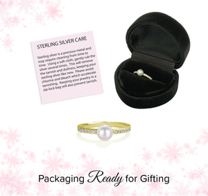 14K gold-plated freshwater pearl baby ring with sparkling CZ band. Designed with all precious metals (sterling silver with 14K gold plating). This makes a precious Pearl Baby Ring for your little princess! These are high-quality rings that are E-coated to prevent tarnish for little girls, toddlers, and kids. This children's ring comes in a beautiful black velvet heart-shaped box and is available in sizes 1-5.