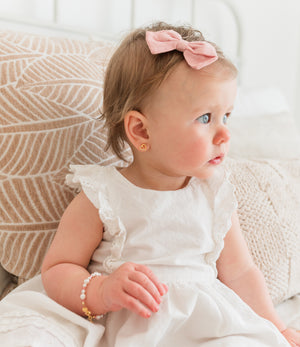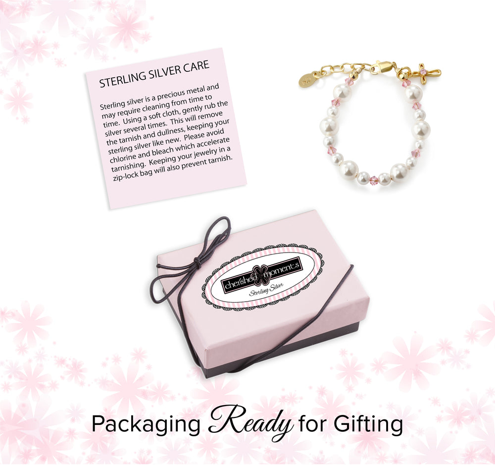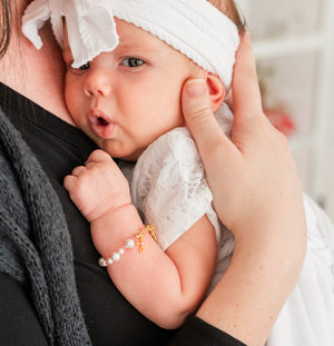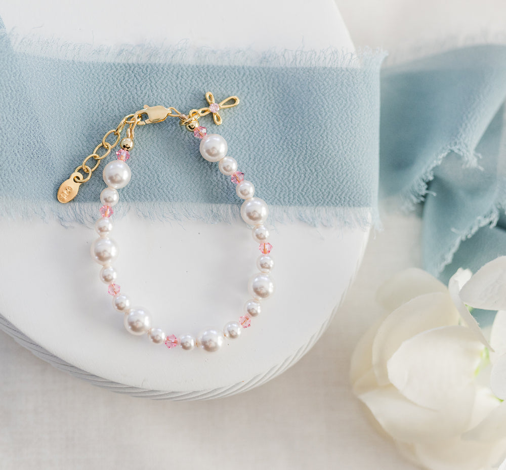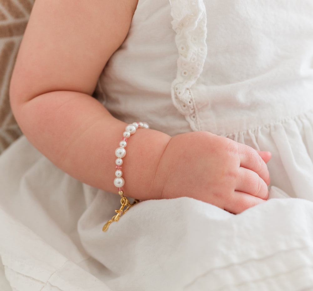 Add a touch of elegance to your little one's look with this gorgeous 14K gold plated pearl cross bracelet, handmade with love in the USA. Perfect for babies, toddlers, and little girls, this bracelet is designed with soft white pearls, beautifully accented by sparkling pink crystals that catch the light with every movement and accented with an infinity cross symbolizing purity, grace and love.
