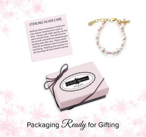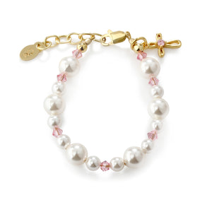 14K Gold-Plated Pearl Pink Cross Bracelet for Baptism or First Communion