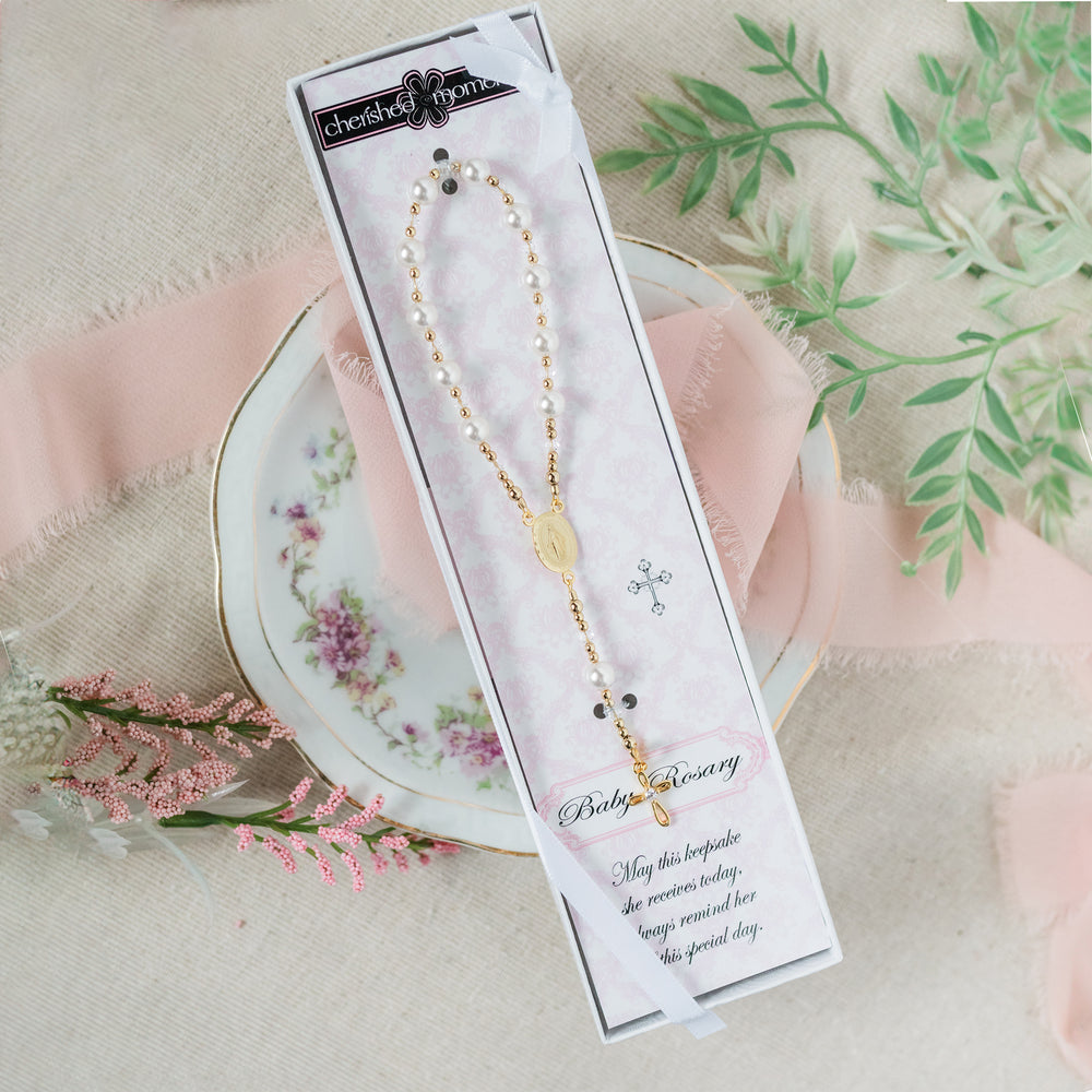 14K Gold-Plated White Baby Rosary Baptism Gift