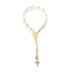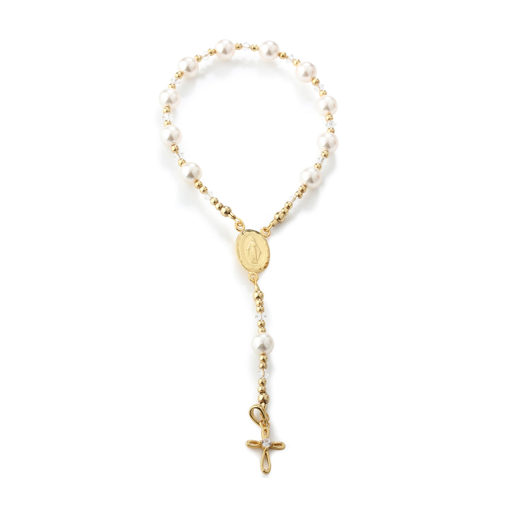 This precious white baby rosary makes a special baptism keepsake designed with 14k gold-plating over sterling silver and designed with exquisite white high-end Austrian simulated pearls and crystals. This features a miraculous medal and cross charm and is packaged as a special keepsake ready for gifting. Celebrate these cherished moments with this keepsake she will treasure forever!