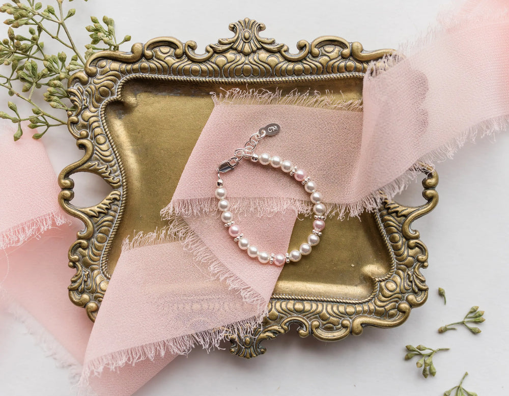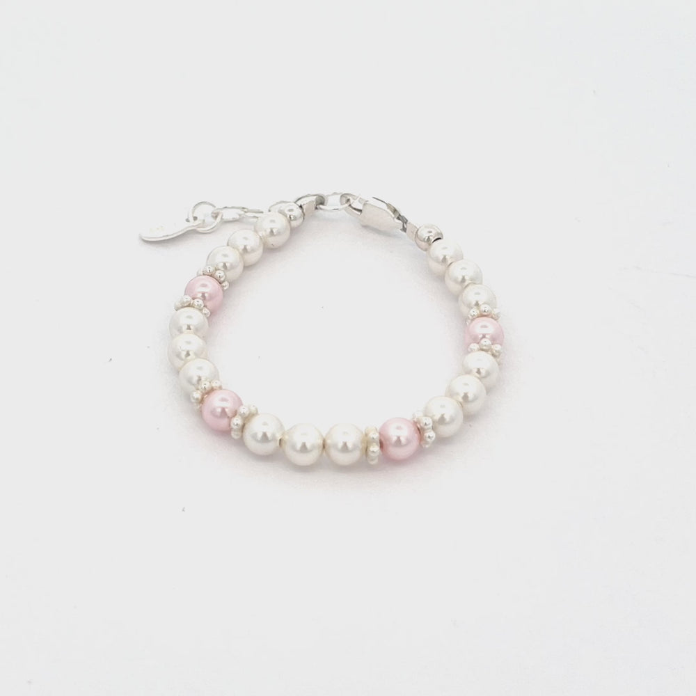 Sterling Silver Pink High-End Austrian Simulated Pearl Baby Bracelet for Babies and Little Girls