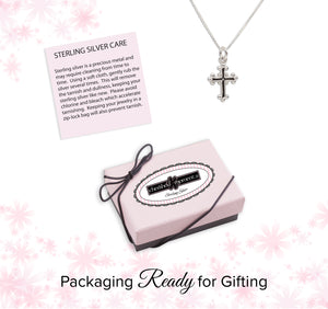 Classic sterling silver intricate cross charm necklace comes on a durable 14" chain or 16-18" (adjustable) Italian chain with a high-quality lobster clasp.  Perfect gift for those special occasions! Makes a great First Communion gift too. Matching earrings available.  This is a special keepsake gift for toddlers, kids, and little girls and comes in a beautiful gift box that kids love.