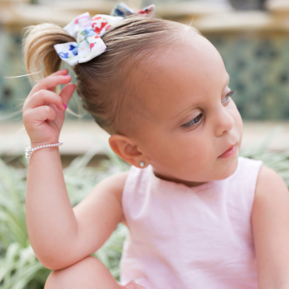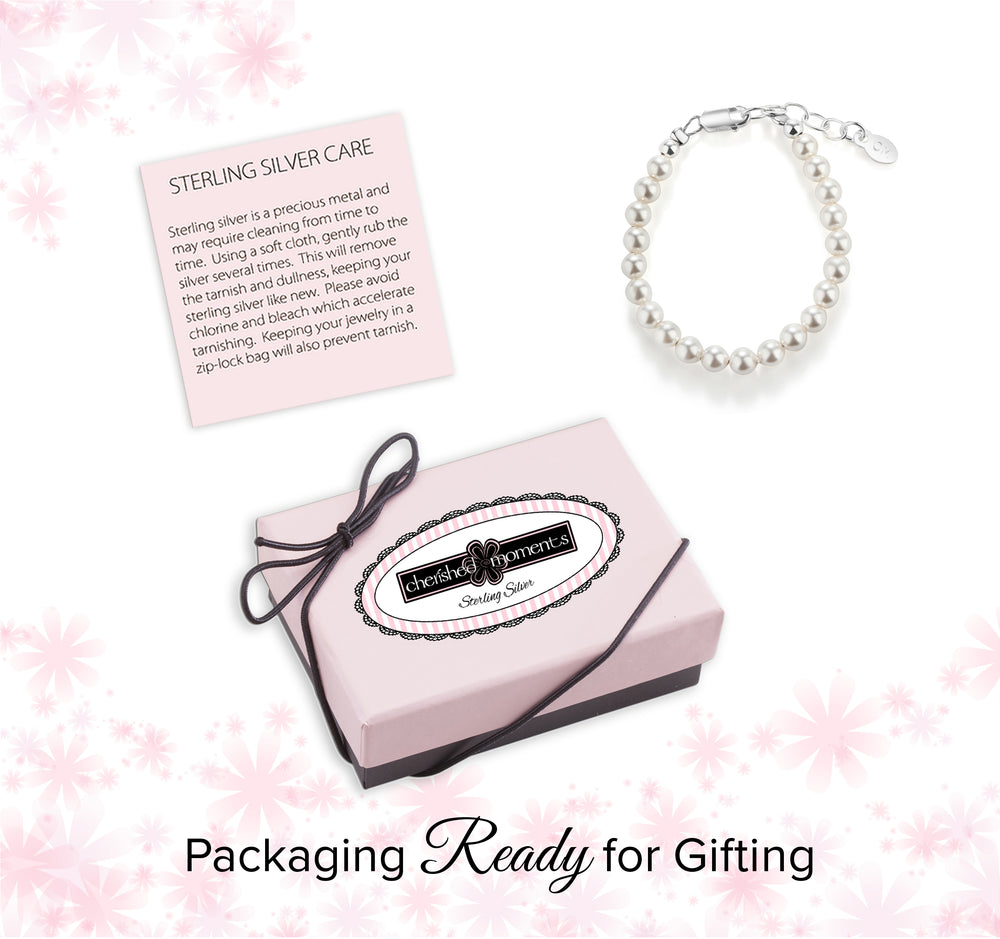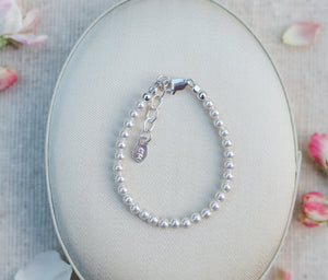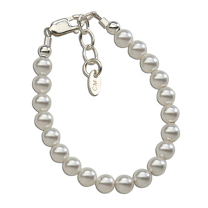 Her first Pearls! Simply beautiful sterling silver bracelet featuring a strand of gorgeous high-end simulated Austrian pearls (4mm). This looks beautiful for flower girls or Jr. Bridesmaid and is a timeless keepsake that makes a perfect baby gift, flower girl gift, or her first pearls! Each bracelet has an extension chain, so as the child grows you just move to the next link for a perfect fit. This bracelet is available in three sizes and is great for infants, babies, toddlers, and kids. This jewelry comes in a beautiful gift box and is hand made in the USA! Celebrate these cherished moments with this keepsake she will treasure forever.