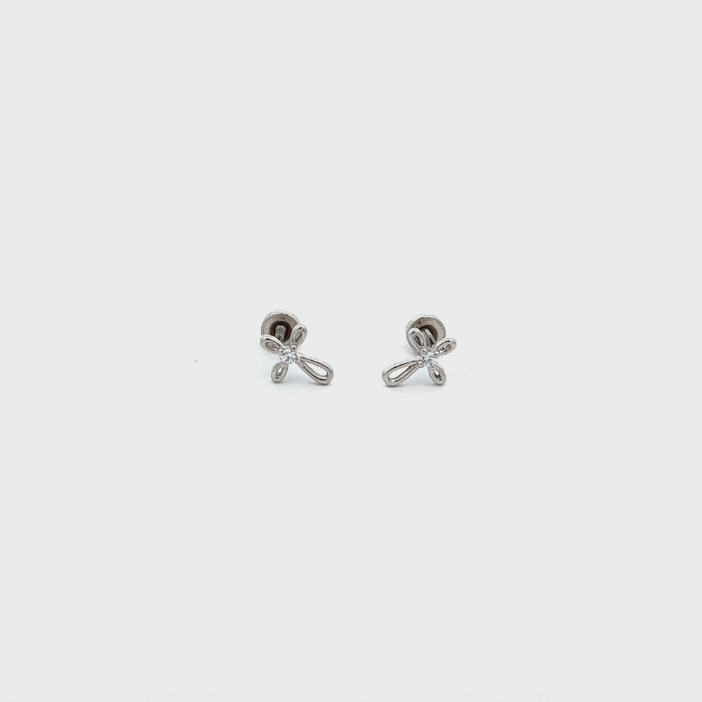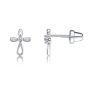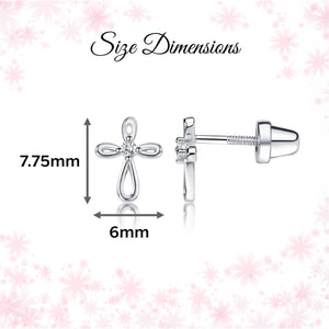Sterling silver infinity cross earrings for little girls. These earrings have screw backs that are so nice for children so they stay put and she won't lose them. Earrings include an extra hypo-allergenic, anti-tarnish finish to keep your pieces sparkling beautifully for years and come in darling black velvet heart gift box!