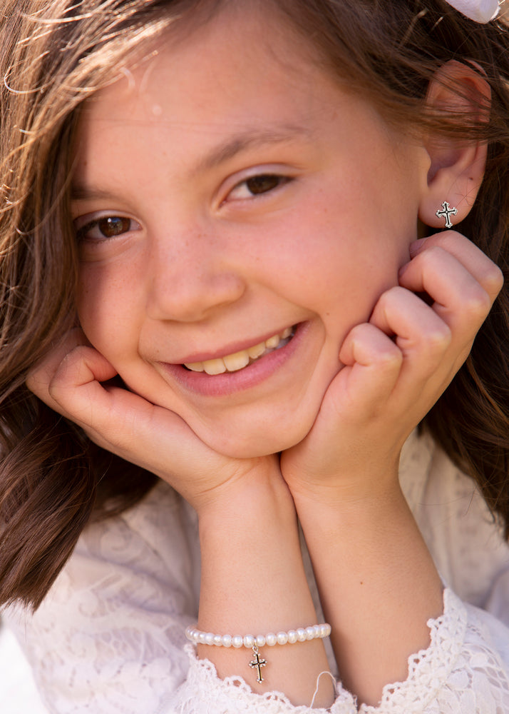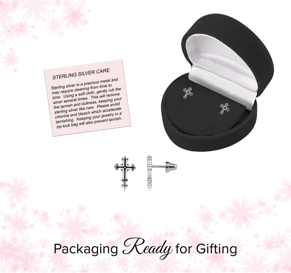 Sterling silver scrolled cross earrings for little girls. These earrings have screw backs that are so nice for children so they stay put and she won't lose them. Earrings include an extra hypo-allergenic, anti-tarnish finish to keep your pieces sparkling beautifully for years and come in darling black velvet heart gift box!