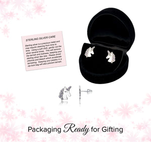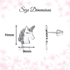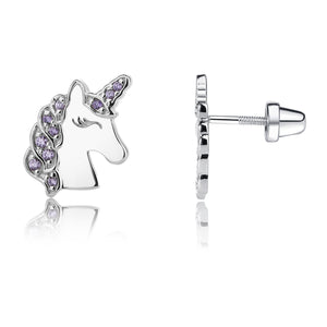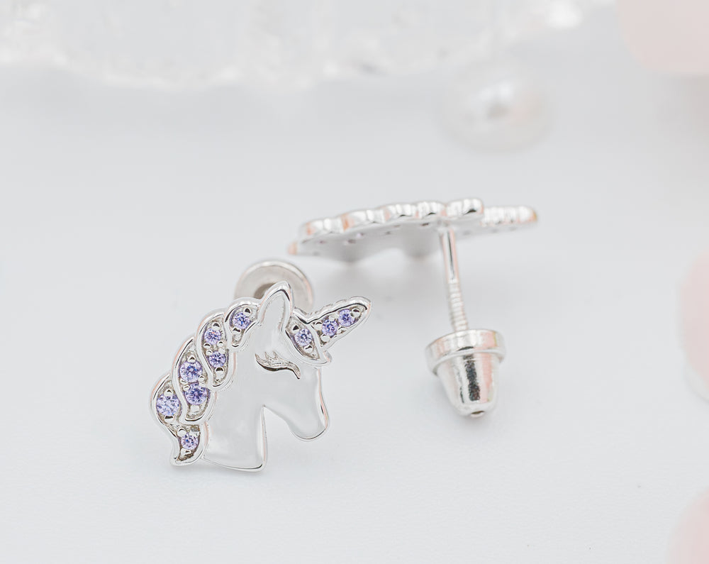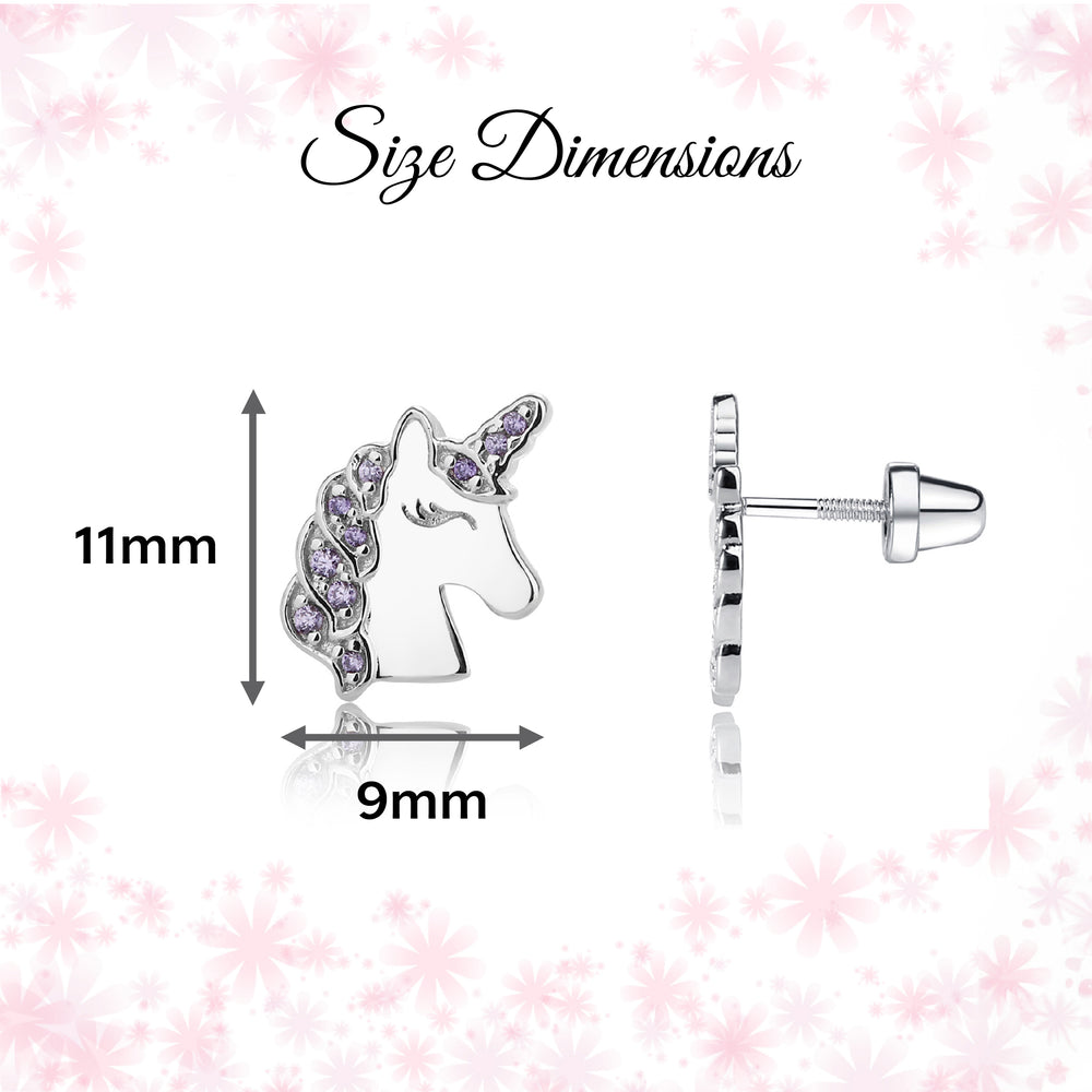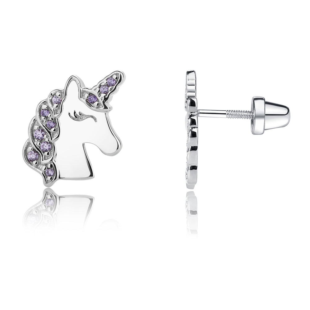 Popular sterling silver unicorn earrings accented with sparking purple lavender CZs and screw back closure so they stay put and won't fall off. Perfect gift for those girls who love unicorns! Earrings comes in beautiful black velvet heart gift box. Matching bracelet and charm necklace are also available.Earrings include an extra hypo-allergenic, anti-tarnish finish to keep your pieces sparkling beautifully for years to come.