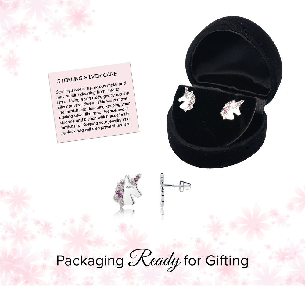 Popular sterling silver unicorn earrings accented with sparking pink CZs and screw back closure so they stay put and won't fall off. Perfect gift for those girls who love unicorns! Earrings comes in beautiful black velvet heart gift box. Earrings include an extra hypo-allergenic, anti-tarnish finish to keep your pieces sparkling beautifully for years to come. Matching bracelet and charm necklace are also available.