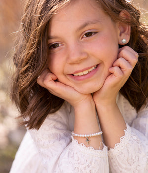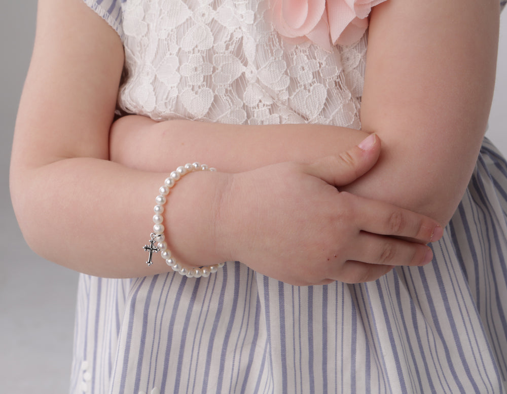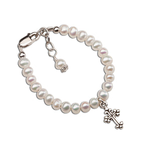 From our "Timeless Collection" this keepsake freshwater pearl bracelet is perfect for baptisms, christenings, dedications or first communion gift. This sweet bracelet is accented in the center with a sterling silver cross and a drop pearl accent. This piece is adjustable, as the child grows you simply move to the next link on the extension chain and is designed with rhodium-plated components to prevent tarnish. Perfect religious gift! This bracelet comes in our Timeless Collection gift box!
