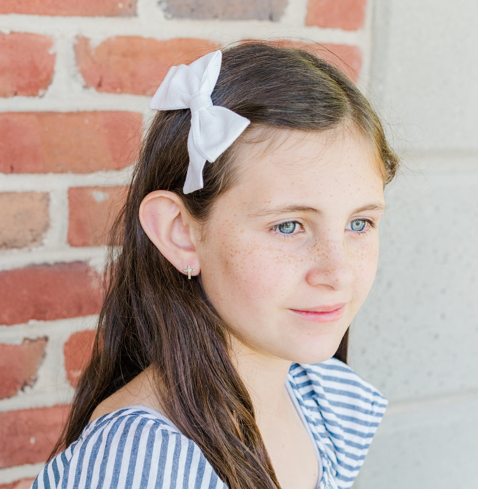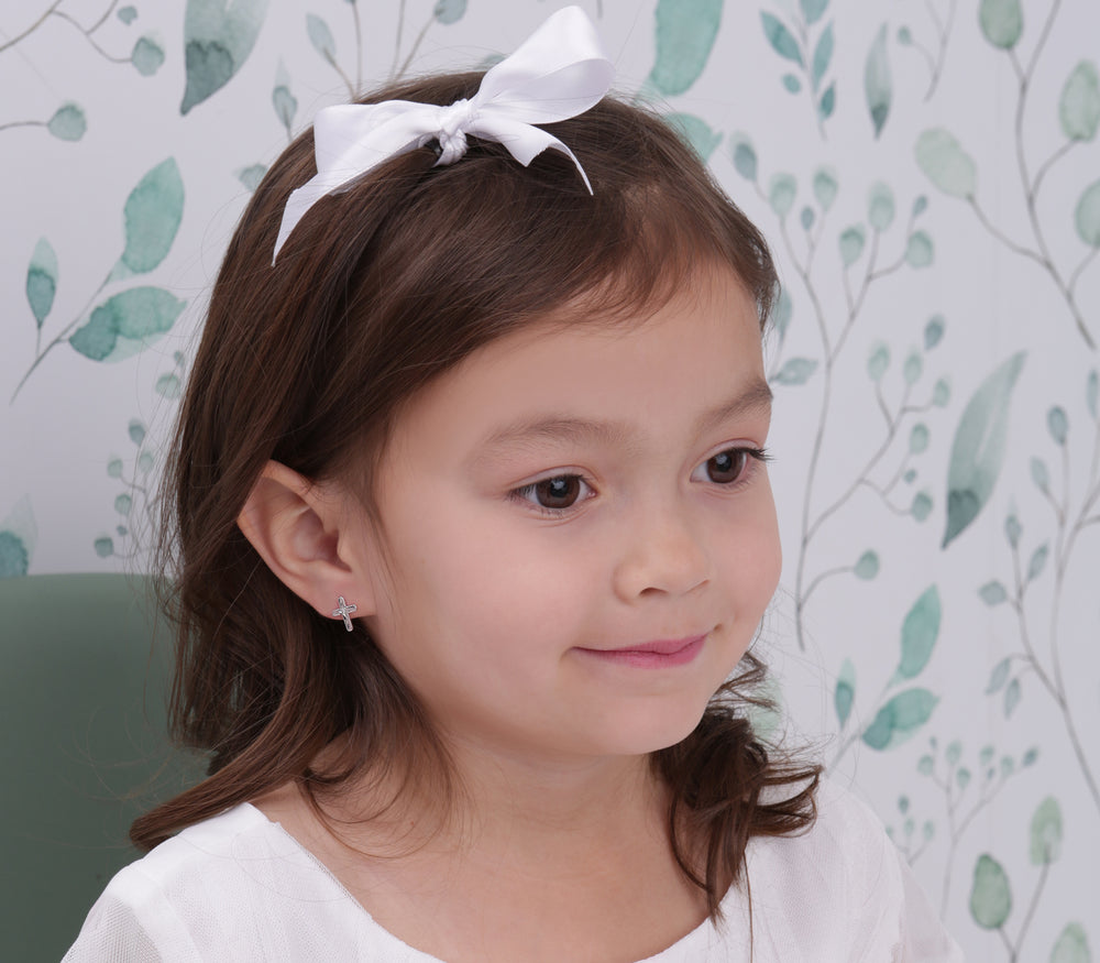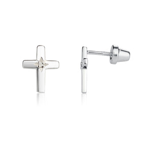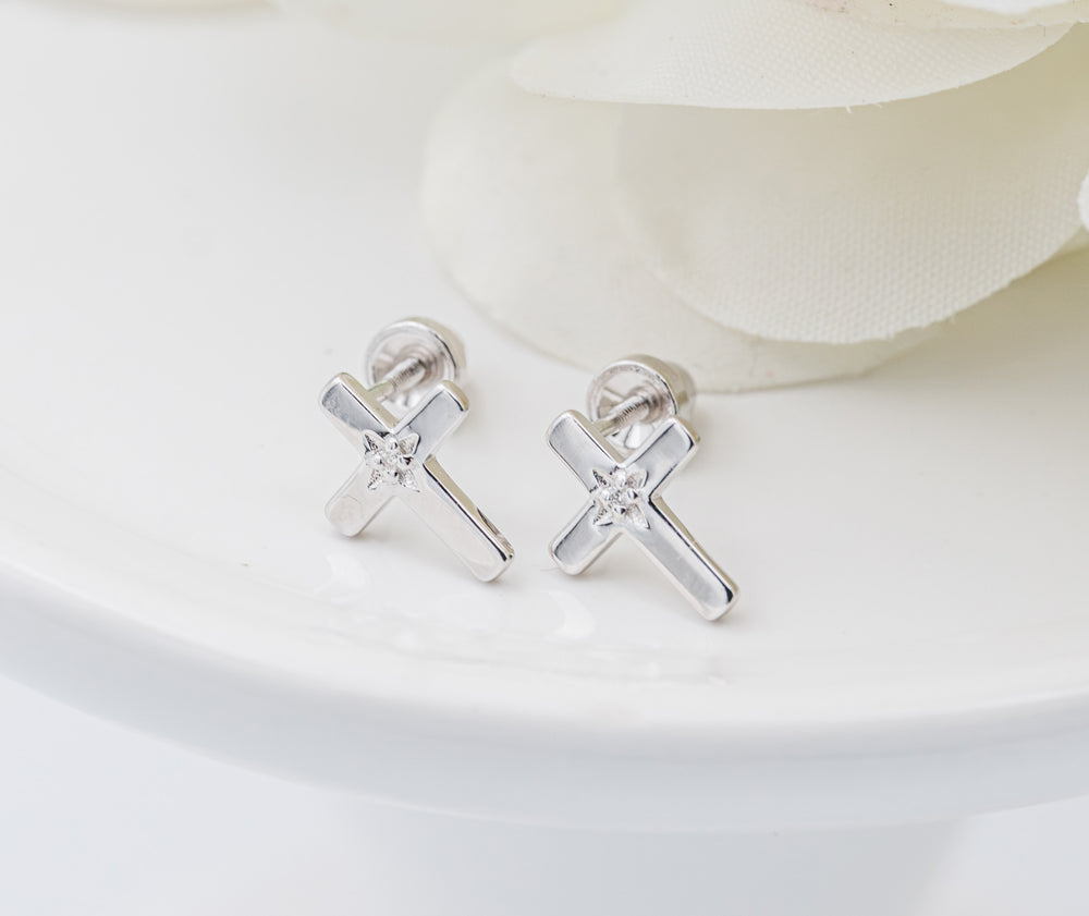 From our "Timeless Collection" these dainty cross earrings with tiny diamonds are a keepsake she will treasure. These cross earrings have screw backs to keep them secure and make the perfect gift for any occasion.  These are rhodium plated to prevent tarnish for everlasting quality.  These beautiful earrings also have a coordinating cross necklace available. Perfect gift for First Communion, Confirmation or Baptism and are presented in special Timeless Collection box.