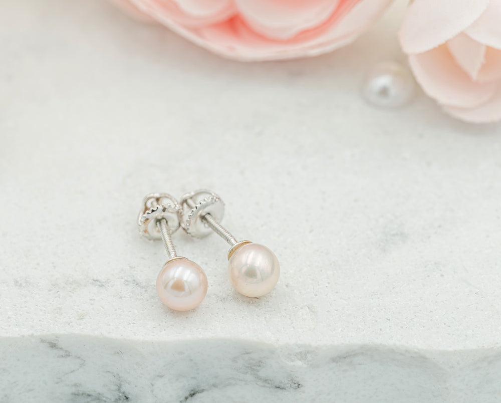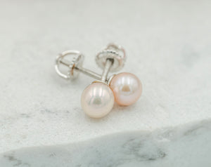 From our "Timeless Collection" these beautiful 4mm freshwater pink pearl stud earrings with screw backs are a keepsake she will treasure. These genuine freshwater pearls make the perfect gift for any occasion. These are rhodium plated to prevent tarnish for everlasting quality. Coordinating necklace is available as well. The earrings come in our Timeless Collection gift box!