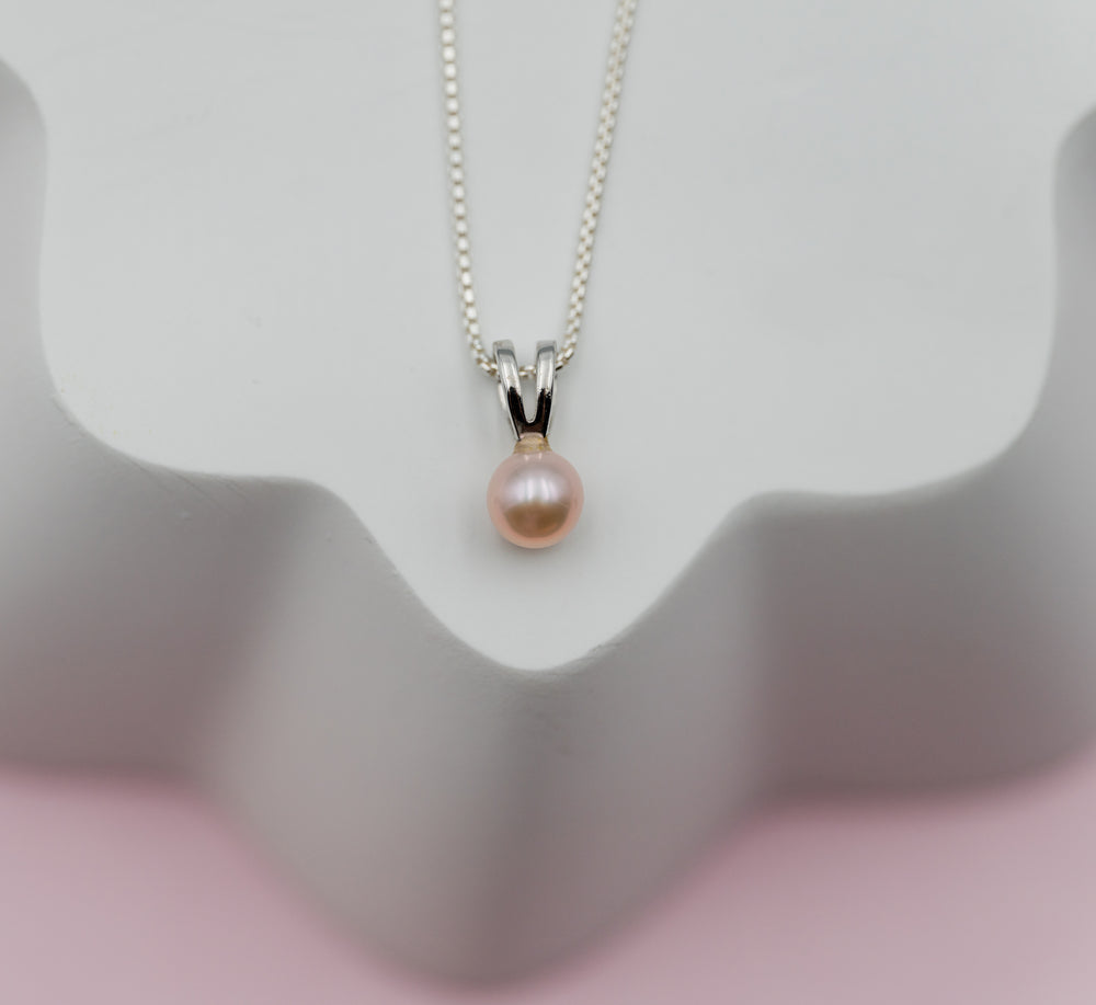 From our "Timeless Collection" this traditional pink pearl pendant for children is suspended on a 14" Italian chain. This charm necklace features a cultured freshwater pearl she will love and a keepsake she will treasure forever. Both the charm and chain are rhodium plated to prevent tarnish for everlasting quality. Matching earrings are available as well. Necklace comes in our Timeless Collection gift box. (5-6 mm pearl)