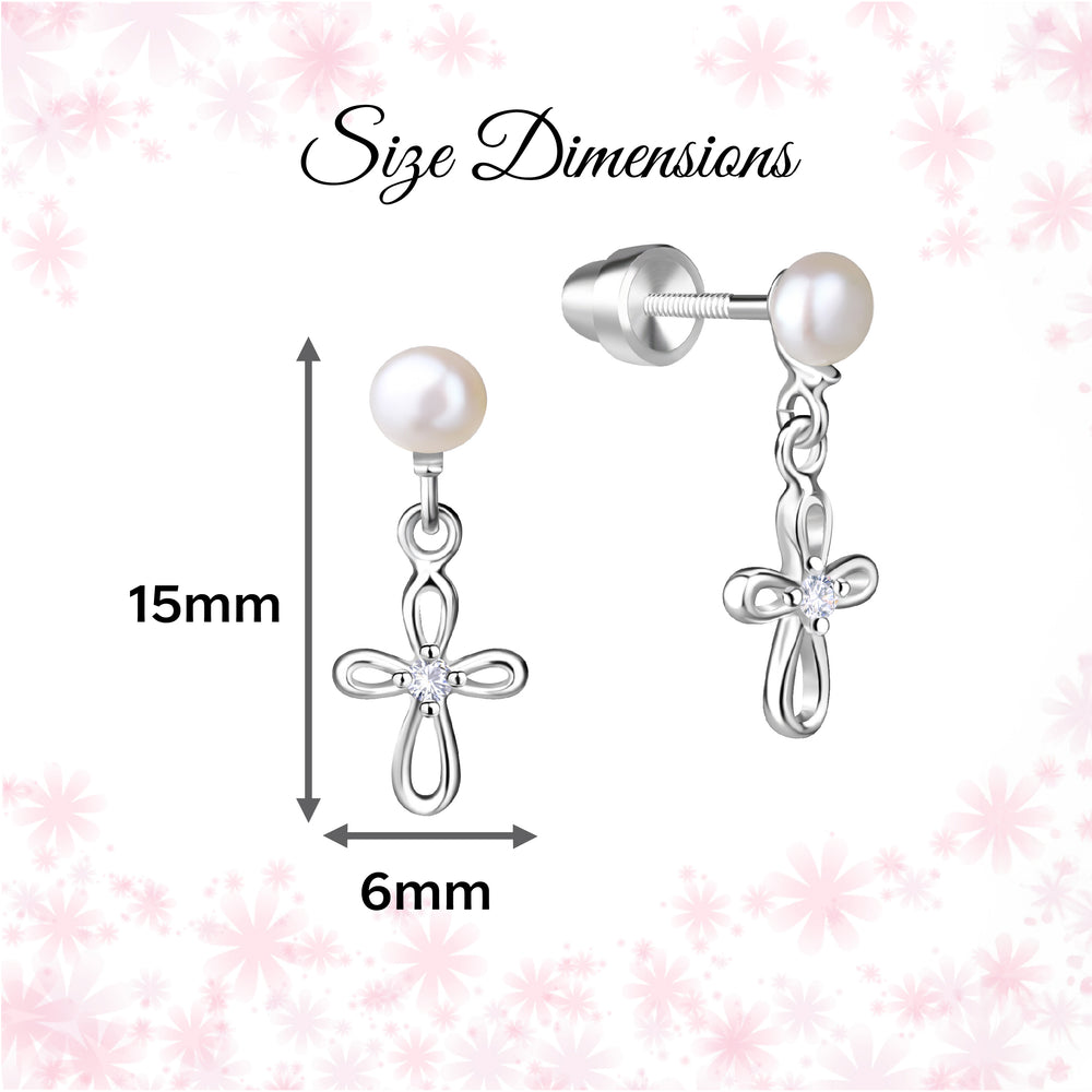 NEW! Sterling silver screw-back cross earrings for baptism designed with freshwater pearl accented with a dainty cross for little girls first communion gift. This cross earrings for baptism have screw backs keeping them secure so she won't lose them. This also have shortened backs to protect the backs of their little ears.