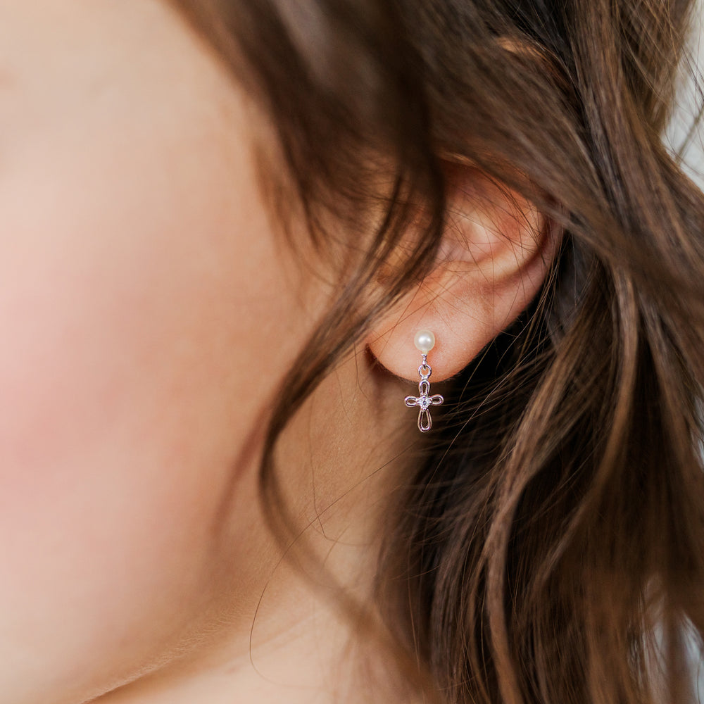 Sterling Silver Pearl w/Cross Earrings for Baptism or First Communion Gift
