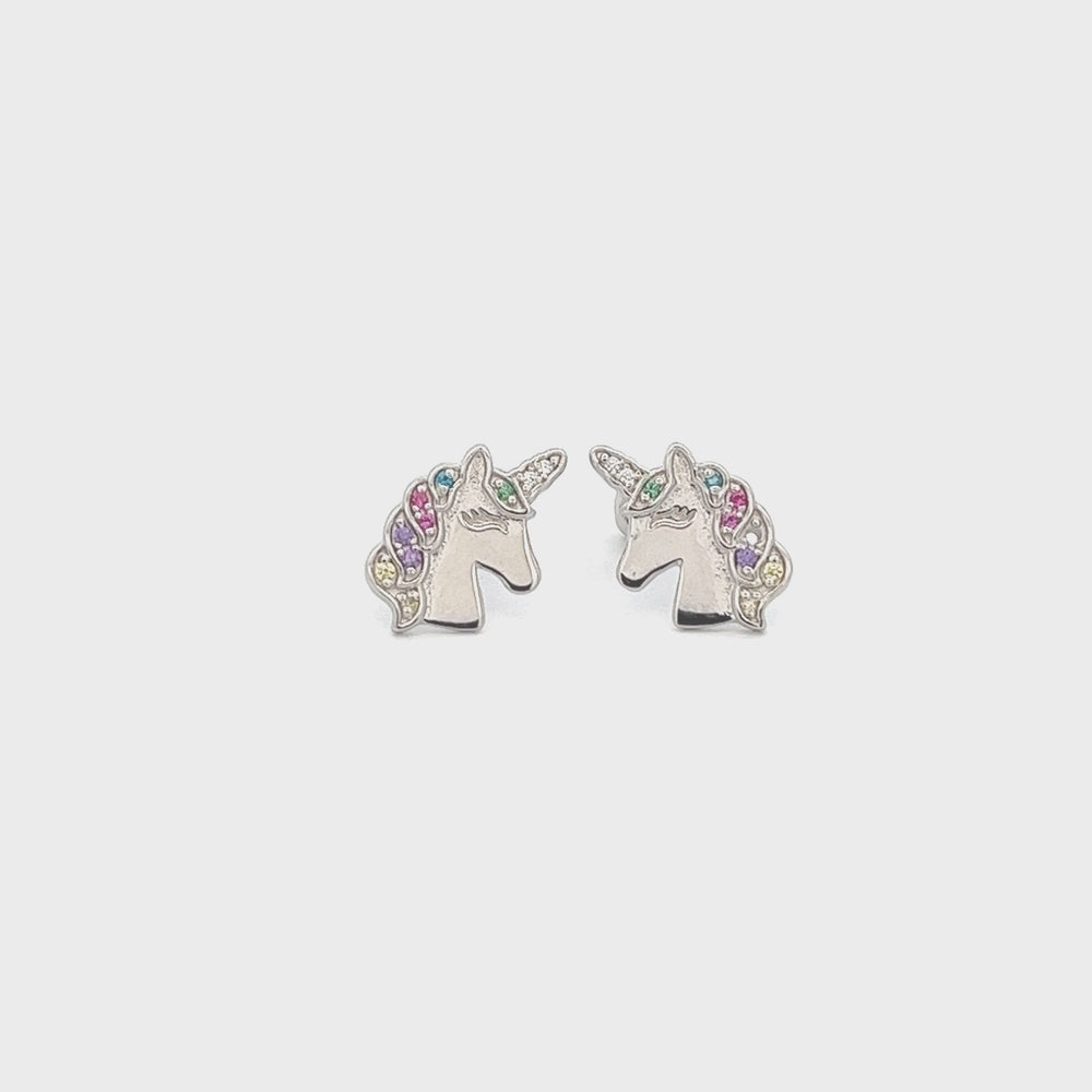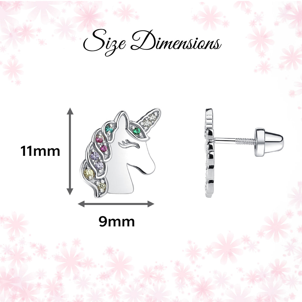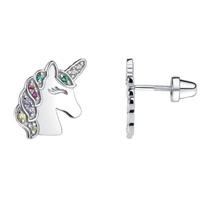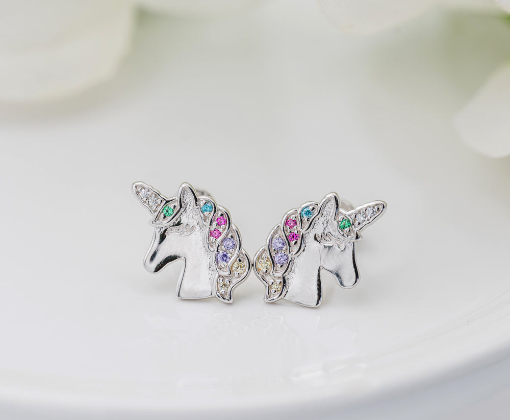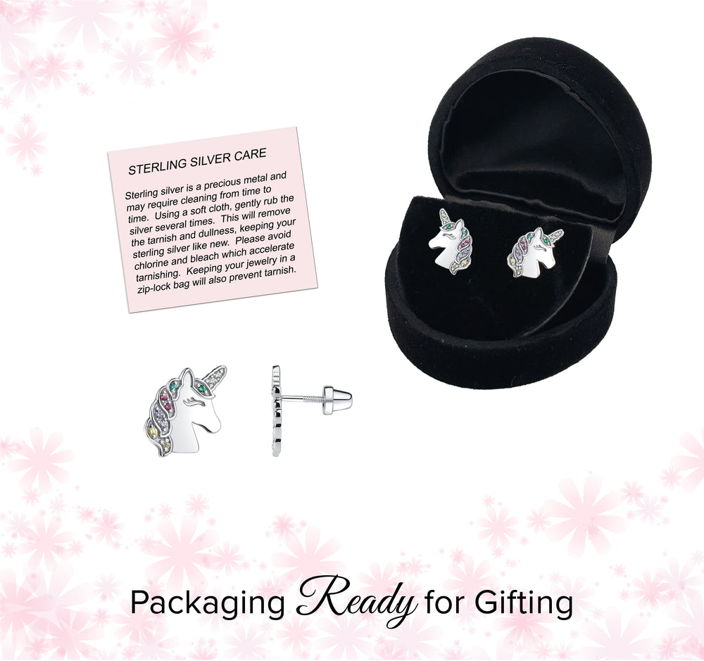Popular sterling silver unicorn earrings accented with sparking rainbow CZs and screw back closure so they stay put and won't fall off.  Perfect gift for those girls who love unicorns! Earrings come in a beautiful black velvet heart gift box. Earrings include an extra hypo-allergenic, anti-tarnish finish to keep your pieces sparkling beautifully for years to come. Matching bracelet and charm necklace are also available.