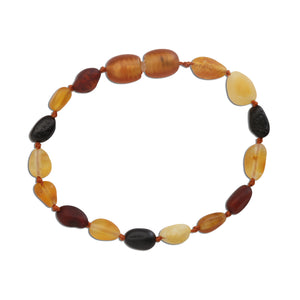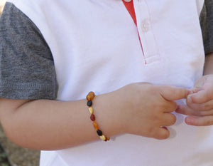 From our "Nature's Beads of Love" Collection - Genuine amber teething bracelet with unpolished or raw beads (multi).  Comfort your sweet baby with these healing amber beads which can reduce drooling and pain when teething.  These amber beads come from Lithuania and are certified 100% natural amber with testing verification from third-party laboratory.