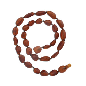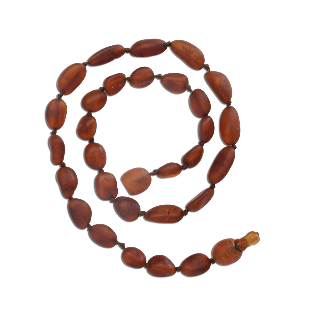 From our "Nature's Beads of Love" Collection - Genuine Baltic amber teething necklace with unpolished or raw beads (dark cognac). Comfort your sweet baby with these healing amber beads which can reduce drooling and pain when teething. These amber beads come from Lithuania and are certified 100% natural Baltic amber with testing verification from third-party laboratory.