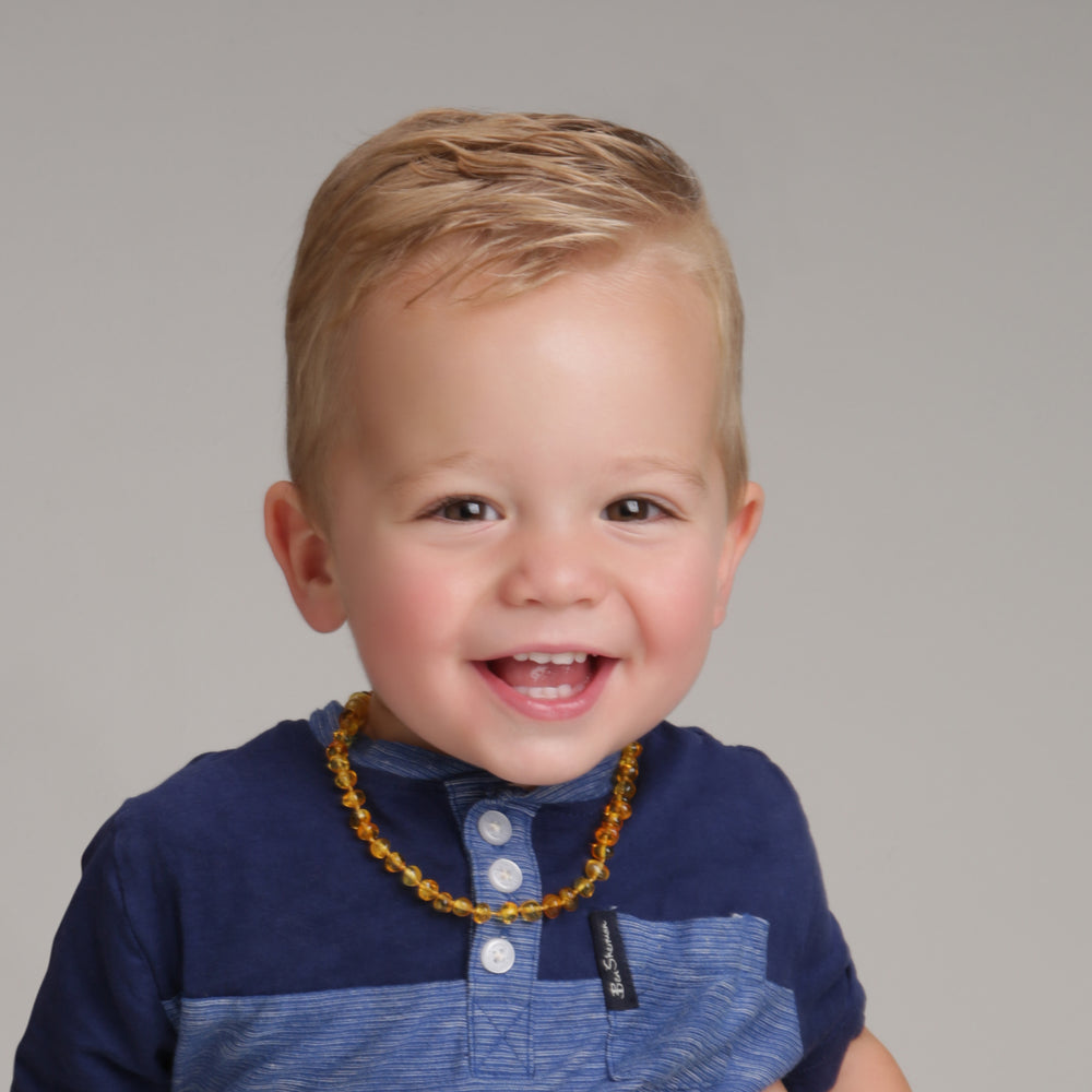 All amber necklaces are double knotted and feature a break-away clasp for child safety (we never use screw clasps on necklaces).  Available in two lengths (11-11.5" and 12-12.5").