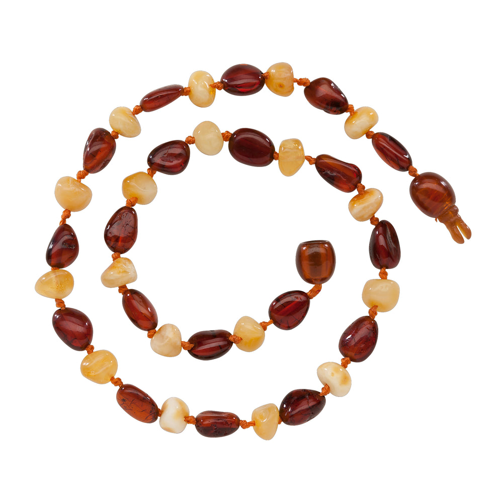 From our "Nature's Beads of Love" Collection - Genuine Baltic amber teething necklace with polished beads (light cherry/milk). Comfort your sweet baby with these healing amber beads which can reduce drooling and pain when teething. These amber beads come from Lithuania and are certified 100% natural Baltic amber with testing verification from third-party laboratory.