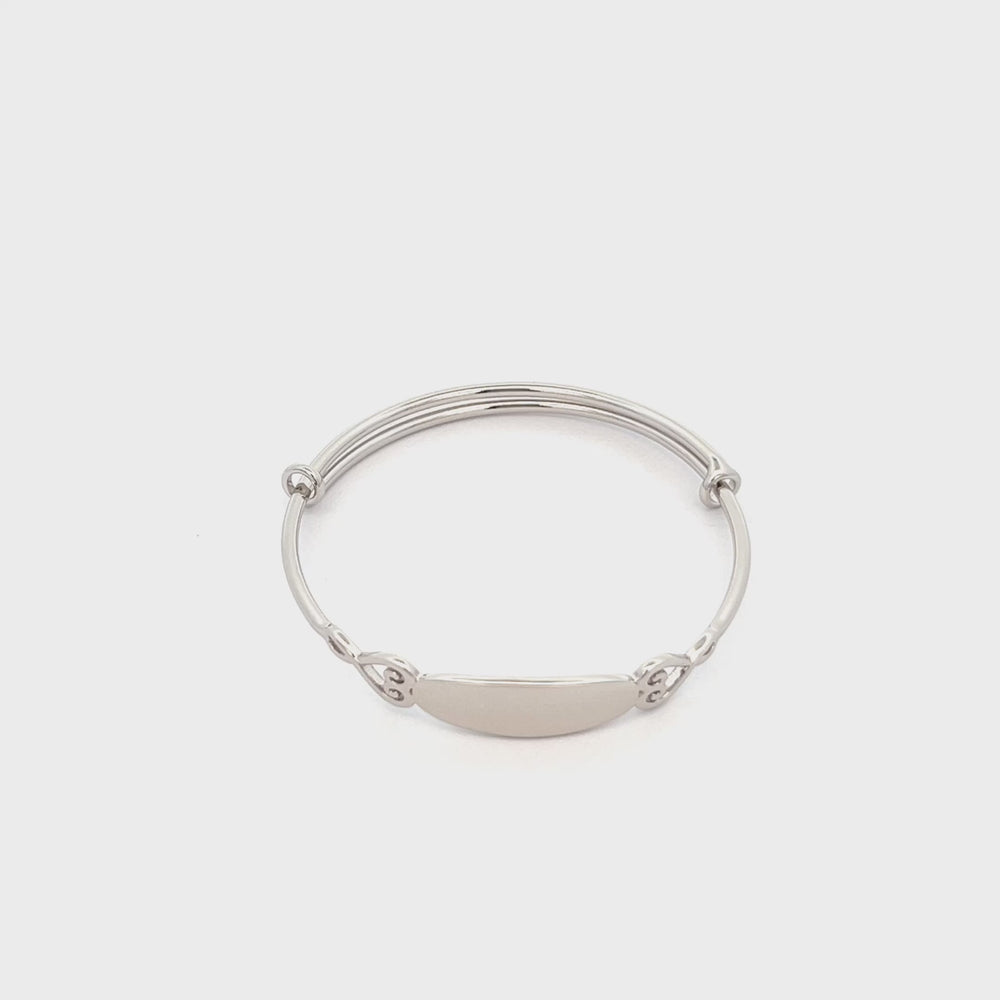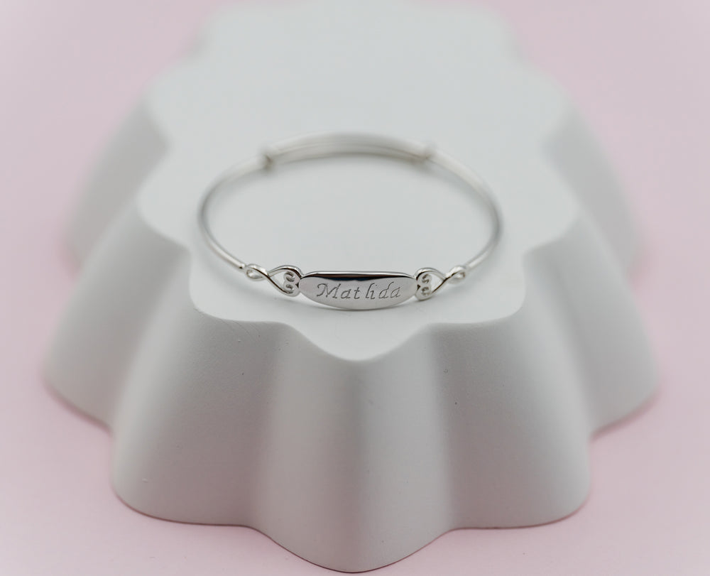 Personalized sterling silver dainty baby bangle featuring a silver engraved oval in the center. This is rhodium plated to prevent tarnish and is an adorable custom gift for baby showers, baptism gift, birthdays, or a special gift from grandma.