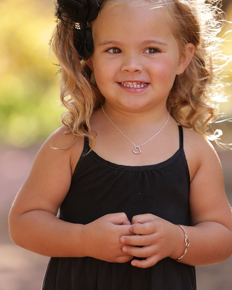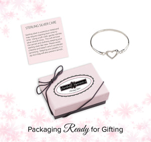 Dainty sterling silver baby bangle featuring an open heart in the center of this bracelet. This opens easily, just squeeze to open and hook latch. This silver bangle comes in a beautiful gift box that kids love. Perfect keepsake she will cherish forever with rhodium plating for everlasting quality.