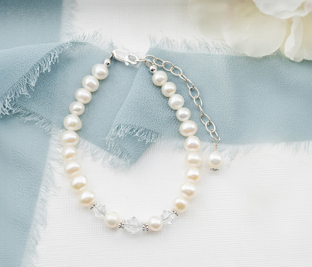 Sterling silver keepsake bracelet great for Baptism Gift "Baptism to Bride" for 8 year old girl. This special keepsake will be a treasure that can be tucked away and cherished again when she becomes a bride. Designed with .925 sterling silver, high-quality freshwater pearls, high-end crystals, and hand-beaded here in the USA. Comes packaged with a sweet poem and includes a place to write her name and special dates along with a special gift box to tuck it away for that special day.