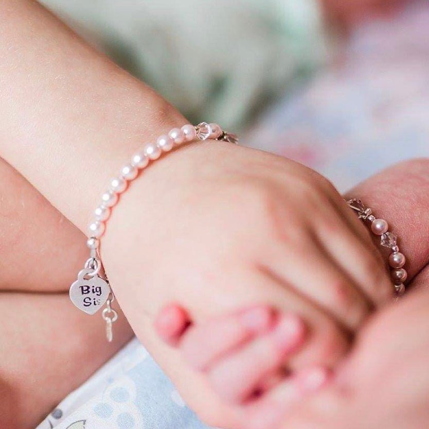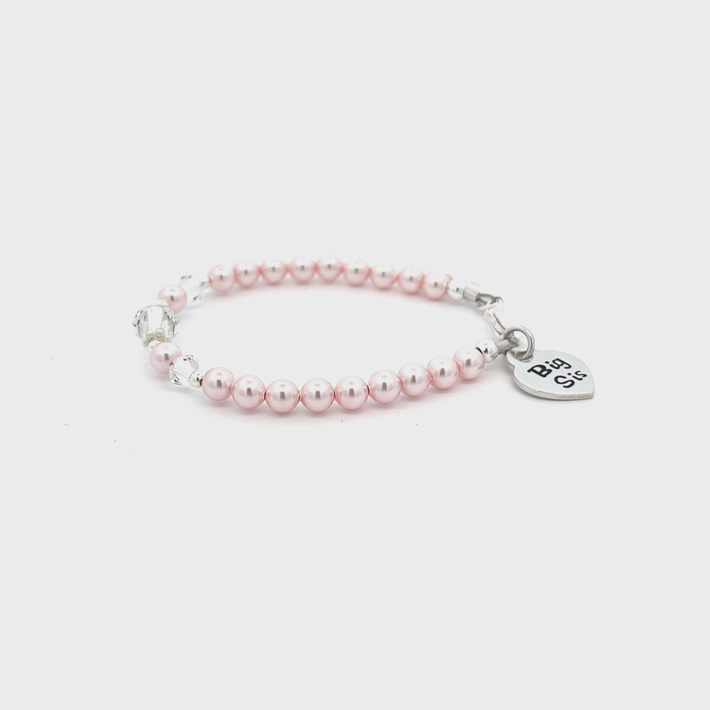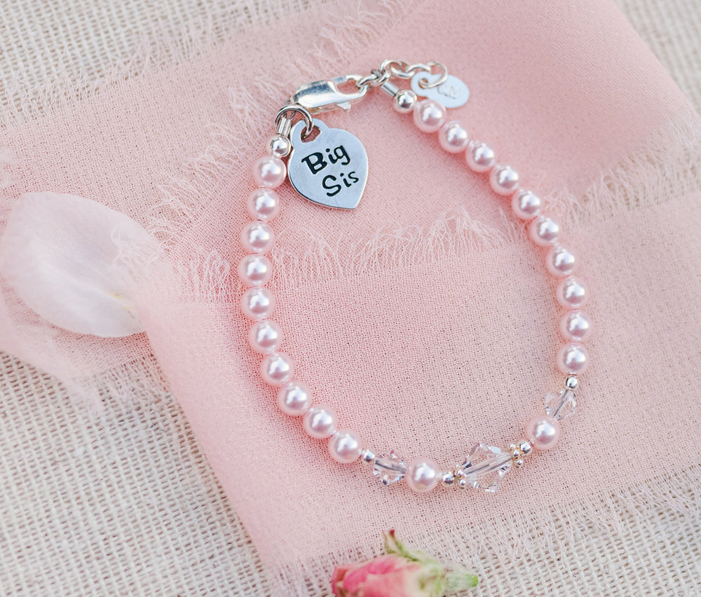 This adorable sterling silver bracelet has soft pink high-end simulated pearls crystals with sparkling silver accents and darling "Big Sis" heart charm - perfect gift for sisters! Bracelet features our adjustable sizing you will love. Just move to the next ring as the child grows for a perfect fit. Bracelet is lead free, nickel free and is safe for your little one to enjoy. Coordinating necklace or matching Lil Sis Bracelet available. Jewelry comes in a beautiful black/pink gift box.