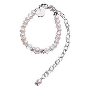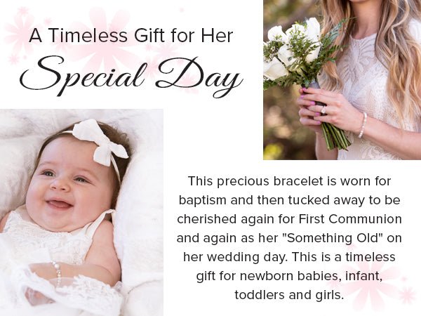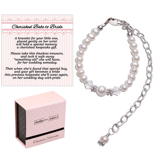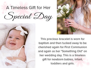 From our Timeless Collection, a popular sterling silver keepsake baby gift "Cherished Babe to Bride" bracelet. This special bracelet will be a treasure that can be worn as a baby and then tucked away and cherished again on her wedding day when she meets that special boy and becomes a bride. This is designed with .925 sterling silver, high-quality freshwater pearls, high-end crystals, and is hand-beaded here in the USA. This comes with a sweet poem and includes a place to write her name and special dates along with a special gift box to tuck it away for that special day. This is an heirloom she will cherish forever.