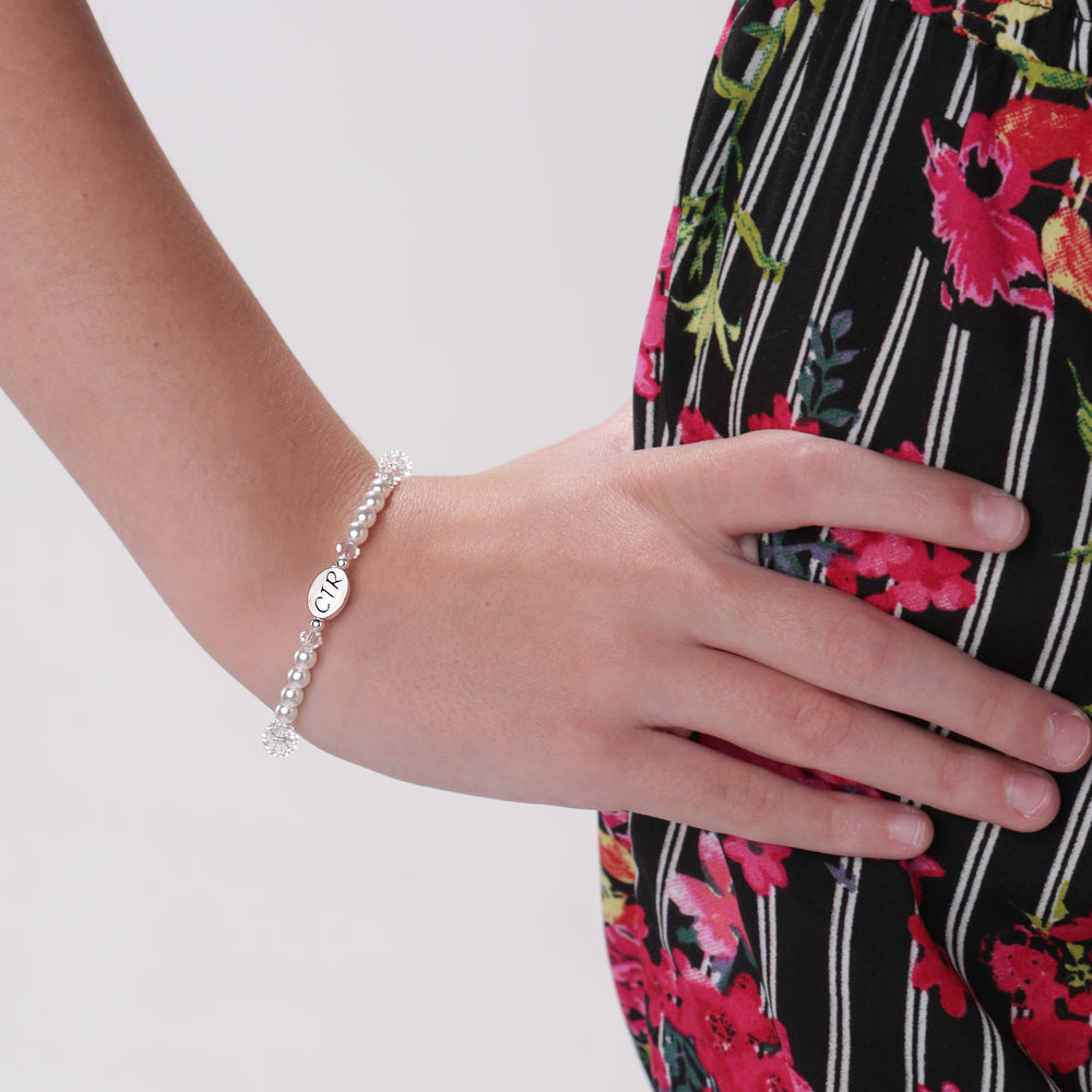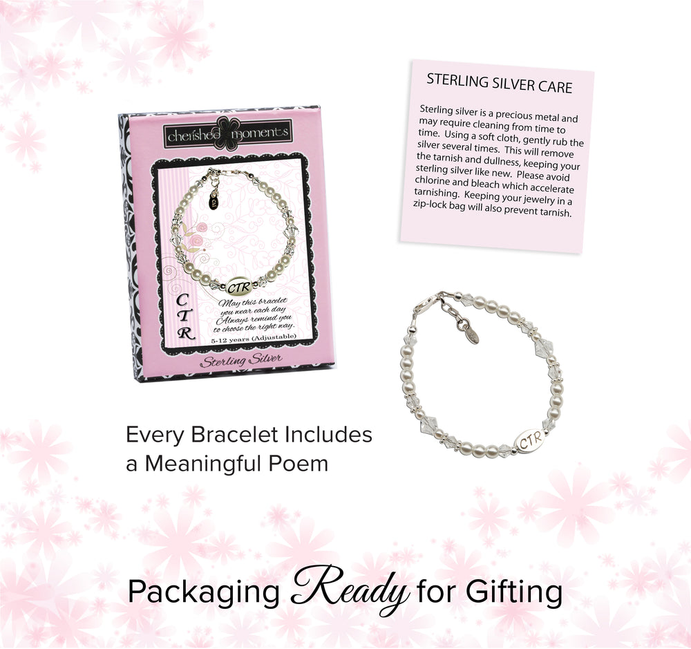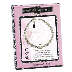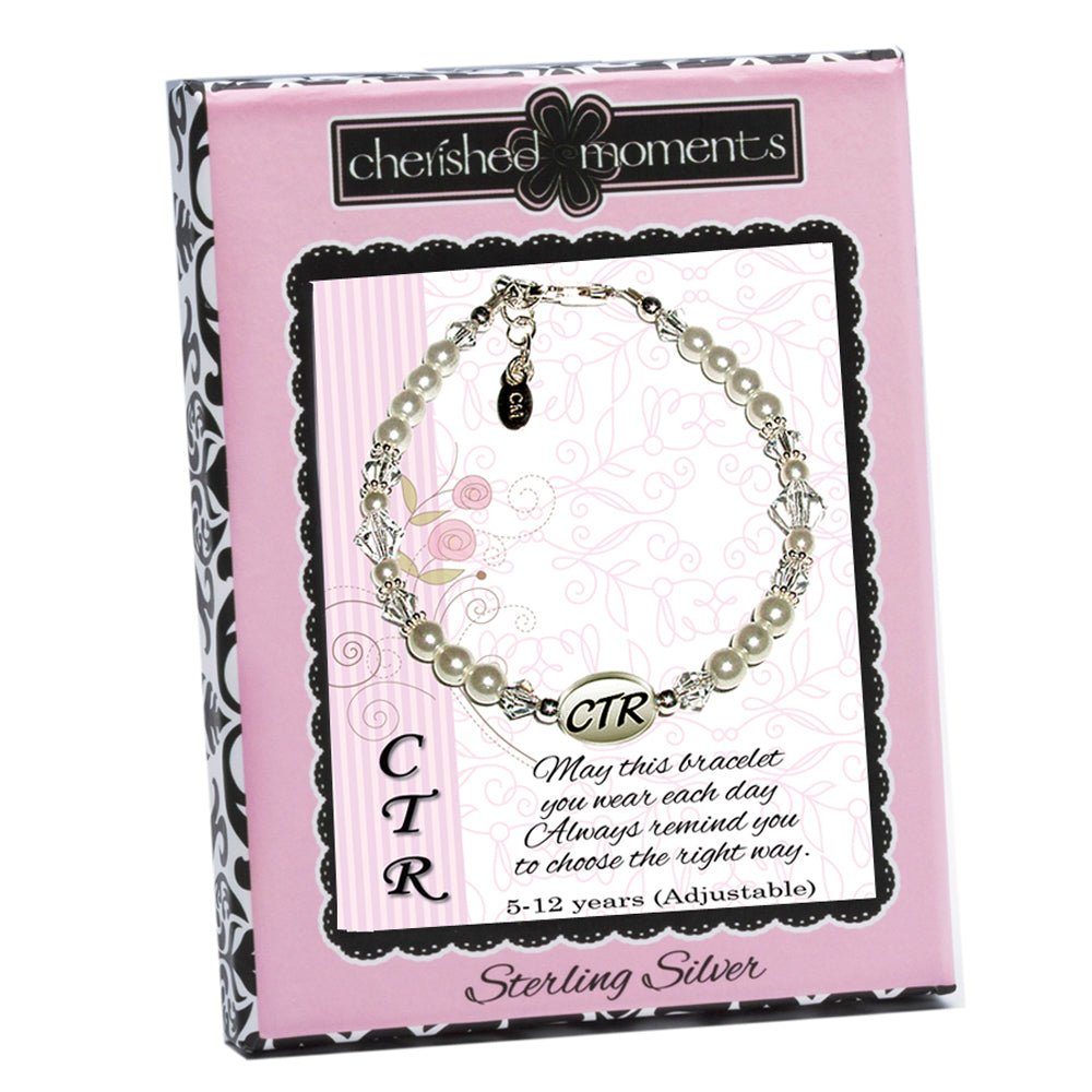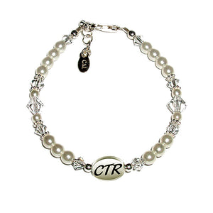 Great LDS Baptism Gift! Beautiful sterling silver CTR "Choose The Right" bracelet for that special occasion with beautiful simulated pearls and sparkling crystals featuring a CTR Charm in the Center! This is adjustable in length 6-6 1/2" and will be a keepsake she will treasure forever!
