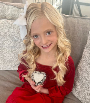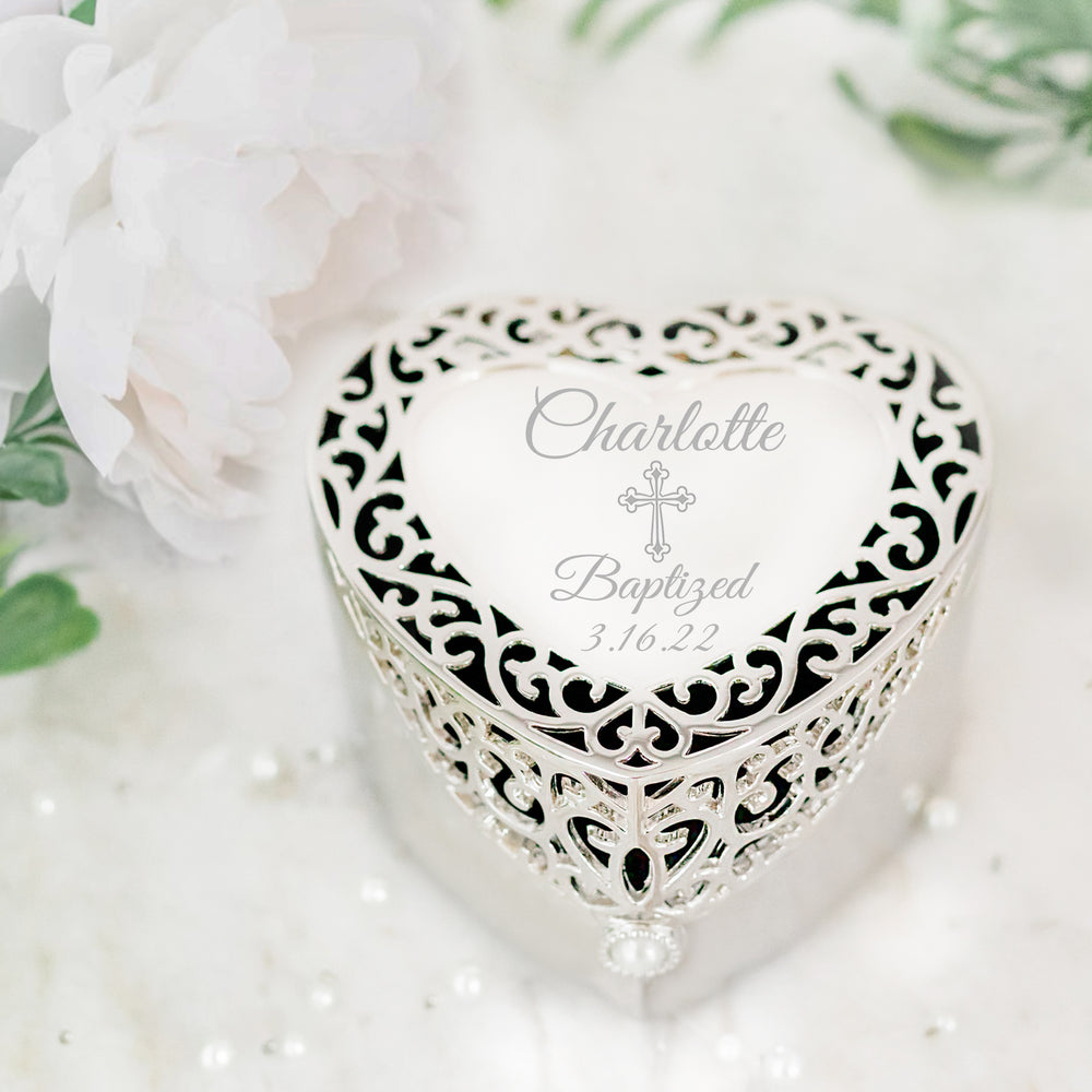 This charming heart-shaped filigree jewelry box is a special gift for flower girls, baptism, first communion, christening, or a sweet baby gift. This is engraved FREE with the sweet sentiment or message of your choice making it a keepsake she will treasure forever! Comes in gift box.