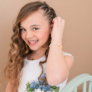 This keepsake bracelet is 14K gold-plated with cultured freshwater pearls, high-end crystals, and a miraculous medal with dainty cross charm! This is a high quality bracelet designed with sterling silver and 14K gold plating. This makes a very special first communion gift. Each bracelet measures 6 inches + .5 inch extension chain, so as the child grows just move to the next link for a perfect fit.