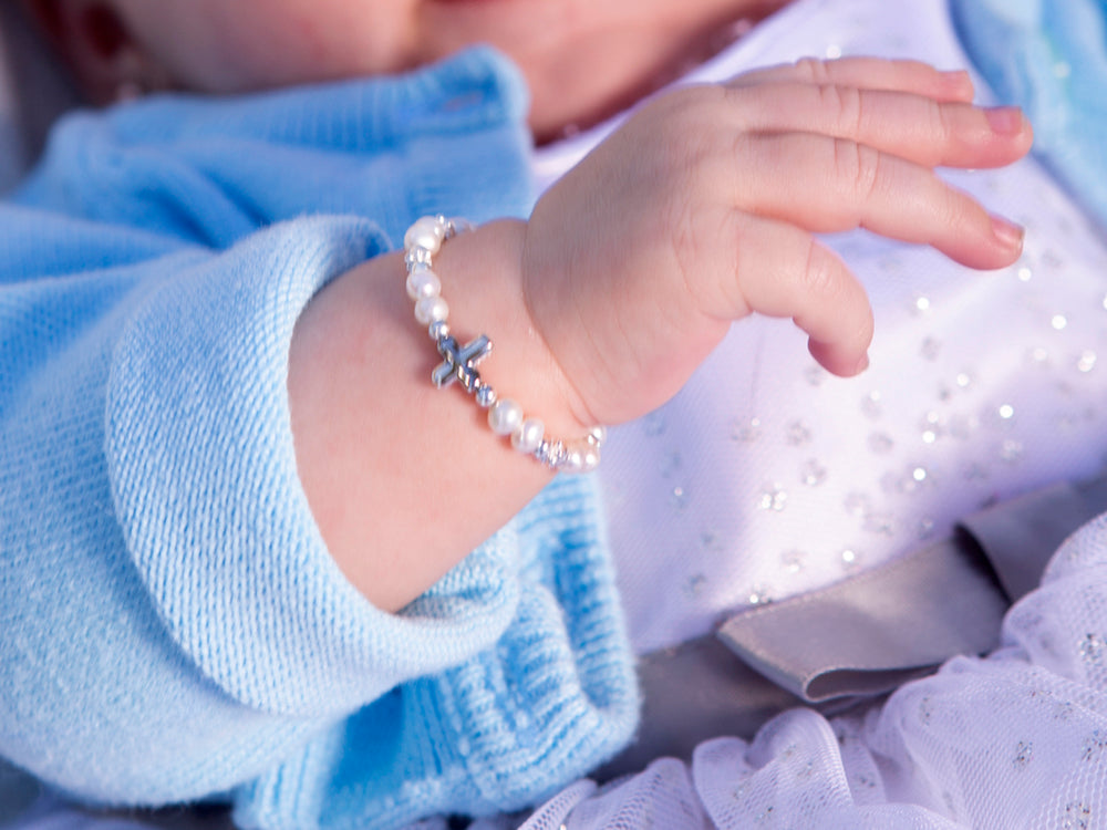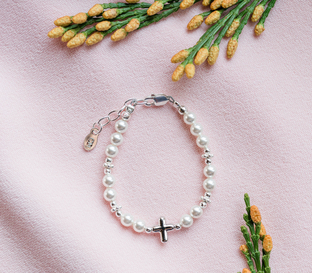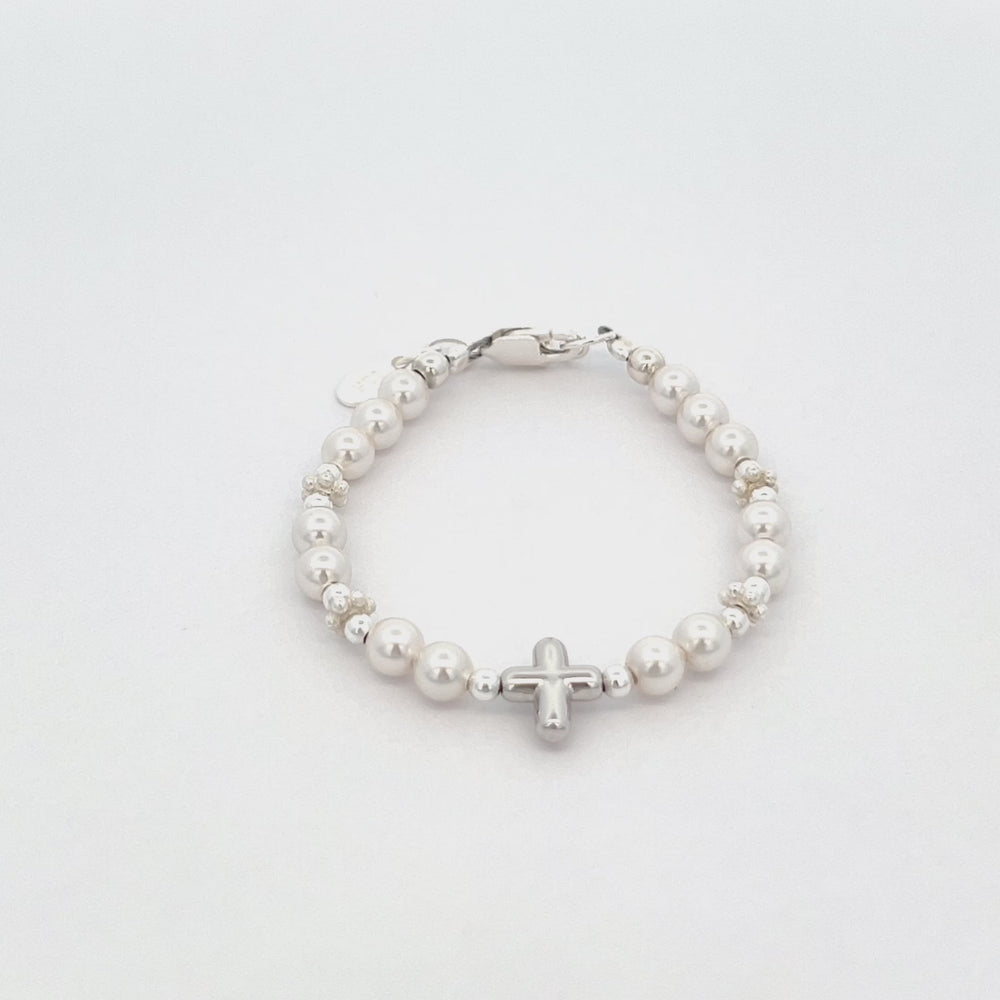Special keepsake bracelet featuring high-end Austrian simulated pearls and accented with a unique silver cross in the center.  This precious bracelet is perfect for christenings, baby baptism, dedication, and first communion. Each bracelet has an extension chain, as the child grows just move to the next link for a perfect fit.  This bracelet is available in three sizes and is great for infants, babies, toddlers, and kids. This cross bracelet comes in a beautiful gift box. A keepsake she will cherish forever.  This jewelry is hand-made in the USA.