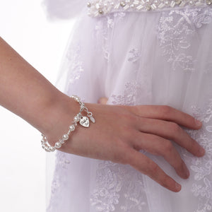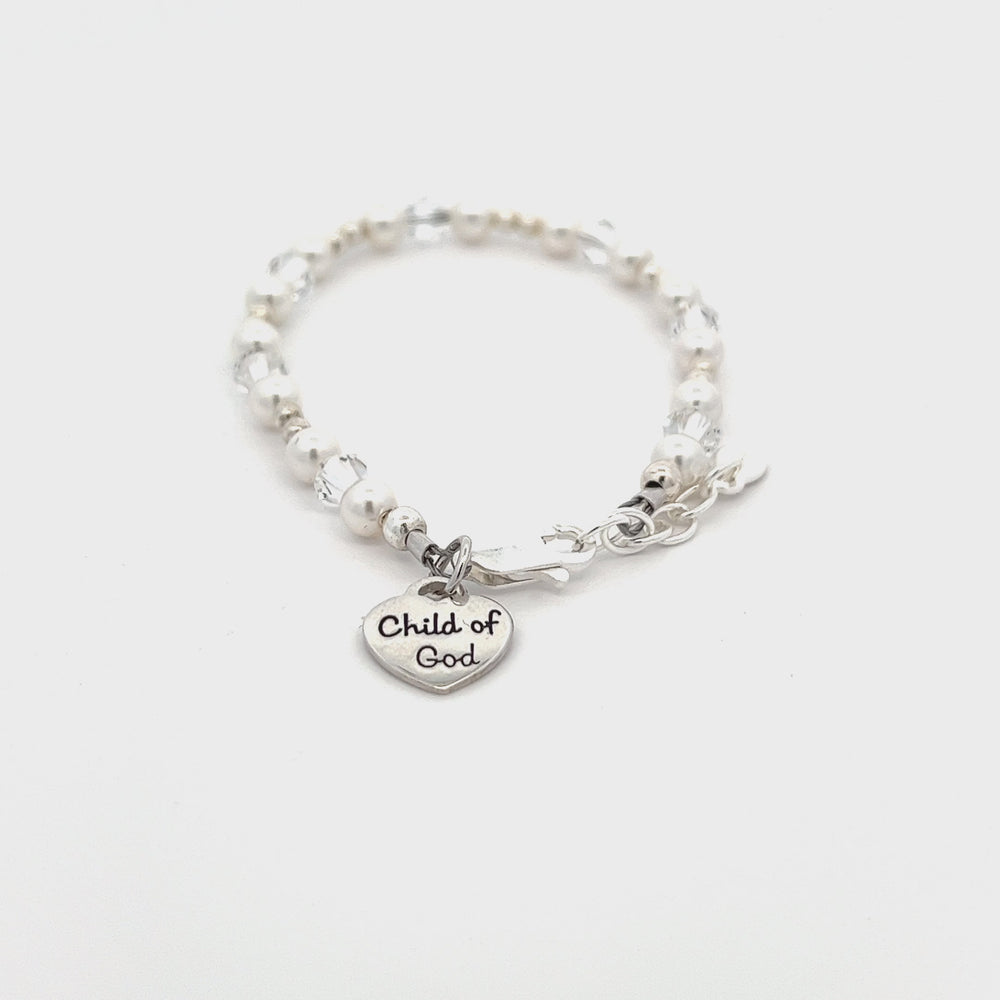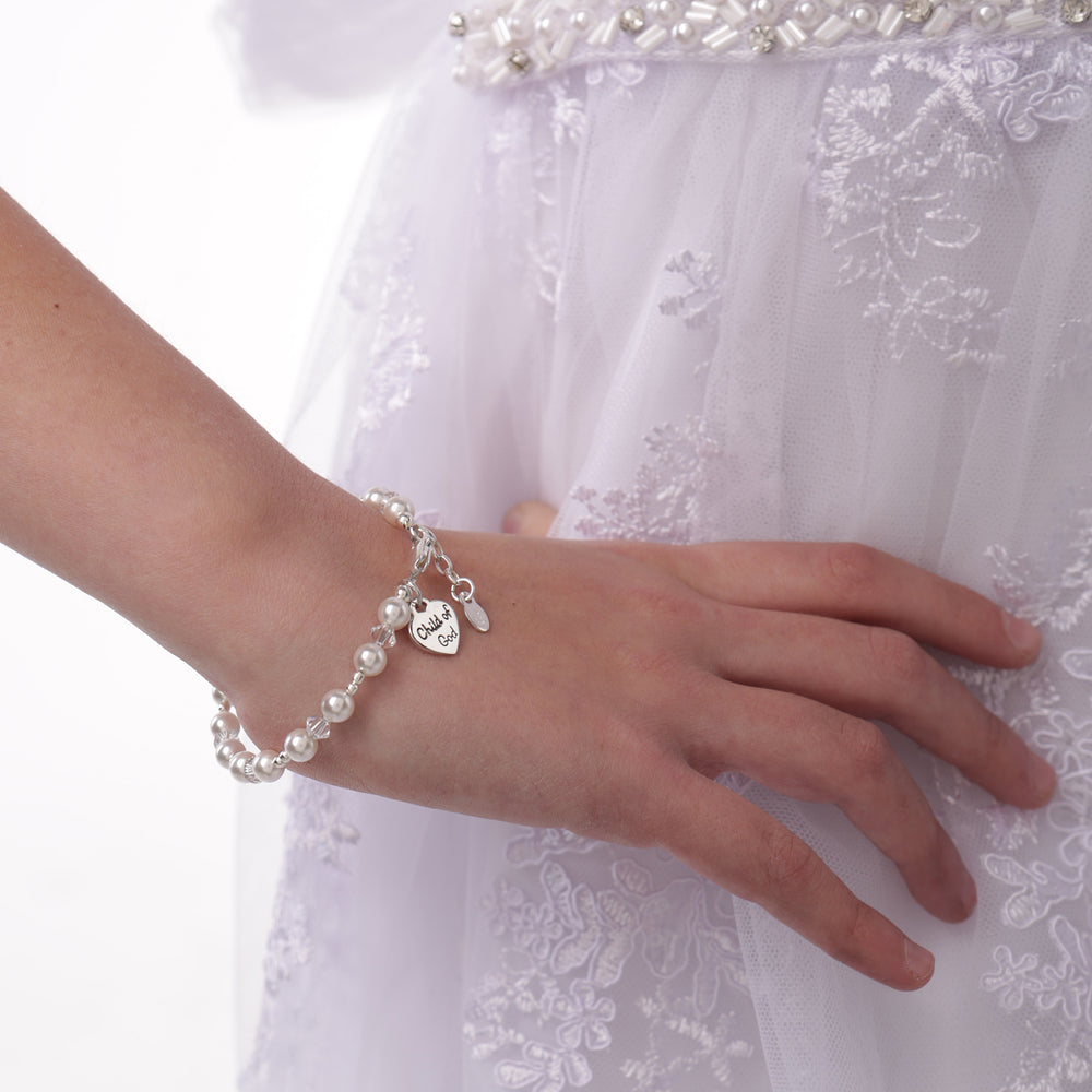 Beautiful sterling silver bracelet for girls with high-end simulated pearls and crystals and "I am a Child of God" Heart Charm. Perfect Baptism or First Communion Gift! Comes packaged in a special gift box. Coordinating necklace available too. A keepsake she will treasure forever!