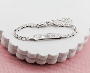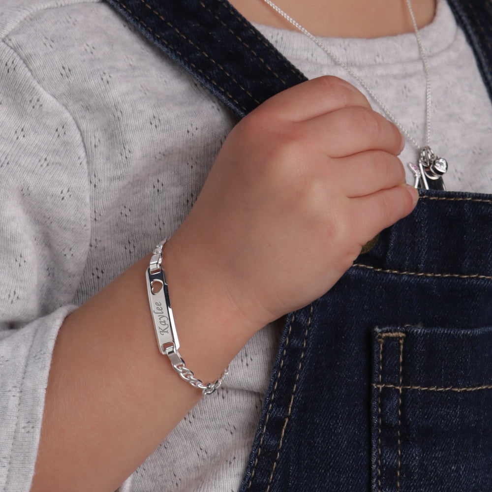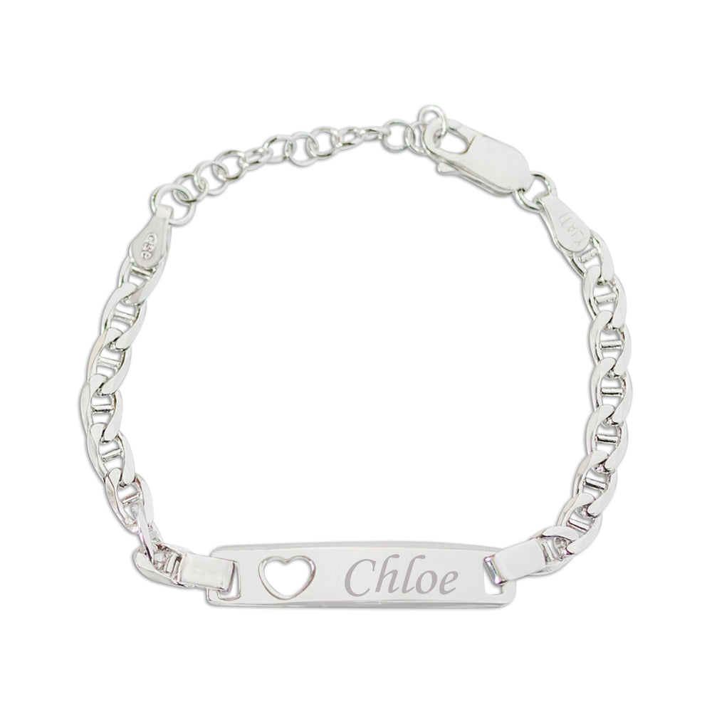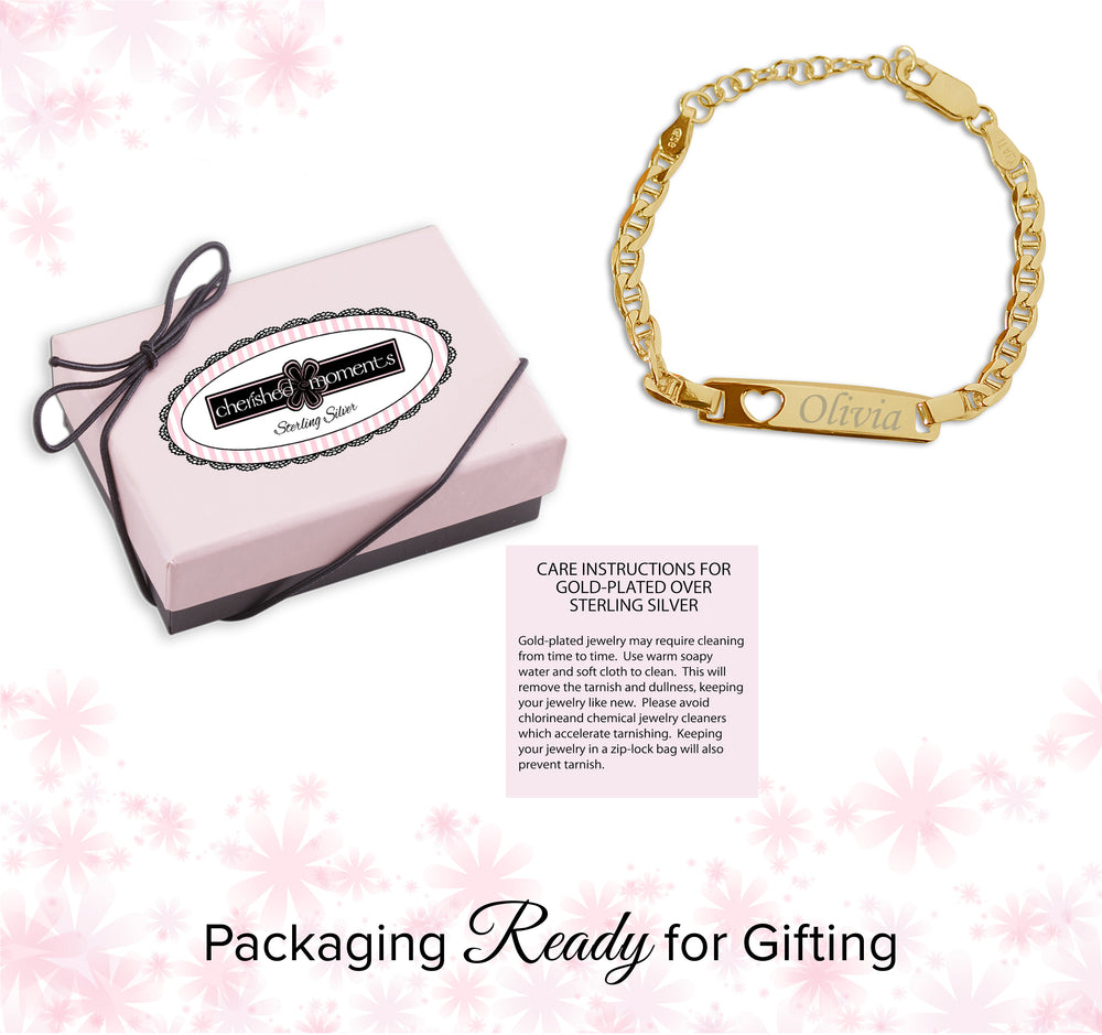 Sterling silver or 14K gold-plated ID bracelet braceletwith cut-out heart and FREE engraving for babies, infants, toddlers, and little girls.  This personalized children's bracelet will make a wonderful gift for a new baby, recital, graduation, or any occasion.  This special keepsake will be something she will treasure forever.  This is available in 3 sizes.