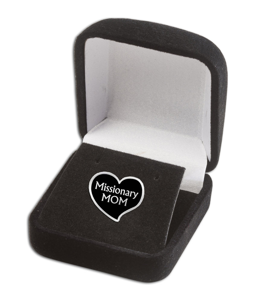 Missionary Mom lapel pin with silver finish this makes a great gift for missionaries, and missionary moms. Great gift for that special mom with a missionary. Comes in nice black velvet gift box.