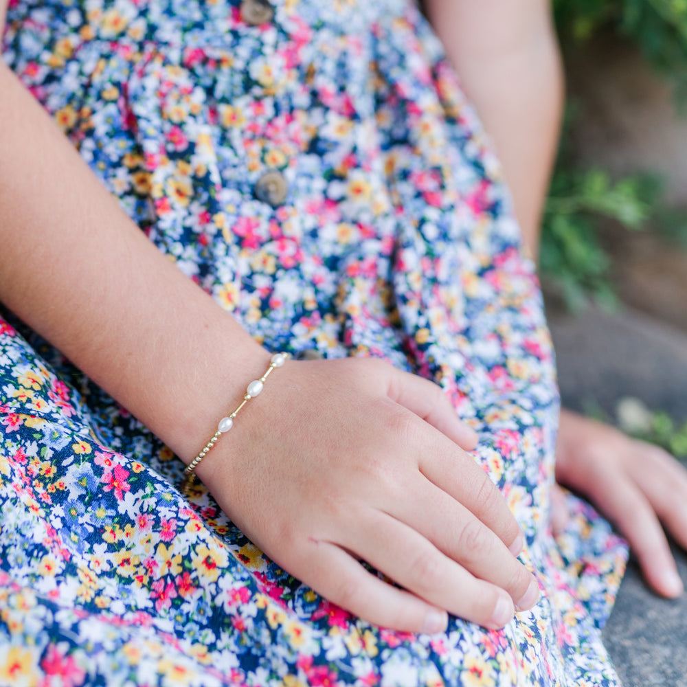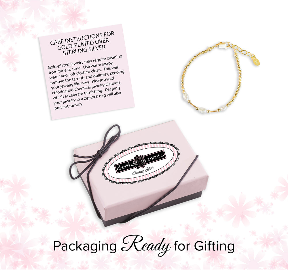 This charming keepsake bracelet is 14K gold-plated (over sterling silver) with freshwater pearls! Beautiful high quality durable bracelet. Great for infants, babies, toddlers, little girls, and kids and comes in a beautiful gift box ready for gifting.