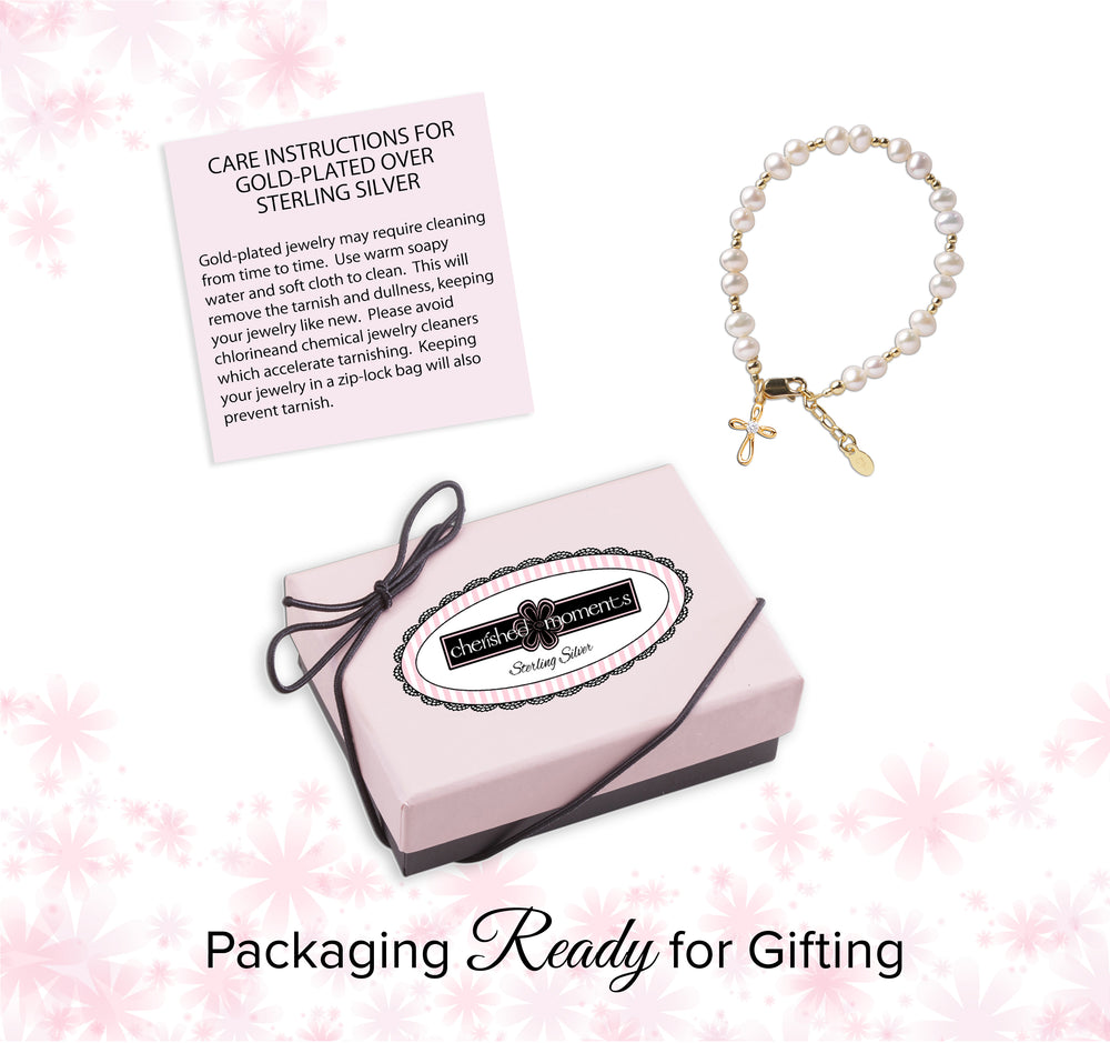 This keepsake bracelet is made with genuine high-end Austrian simulated pearls and 14K Gold-plated beads accented with a dainty infinity cross charm embellished with a sparkling CZs! This is a high quality bracelet in sterling silver with 14K gold plating. This makes a very special baptism, christening, or dedication gift or First Communion Keepsake. Each bracelet has an extension chain, as the child grows just move to the next link for a perfect fit.