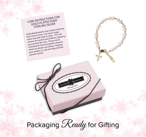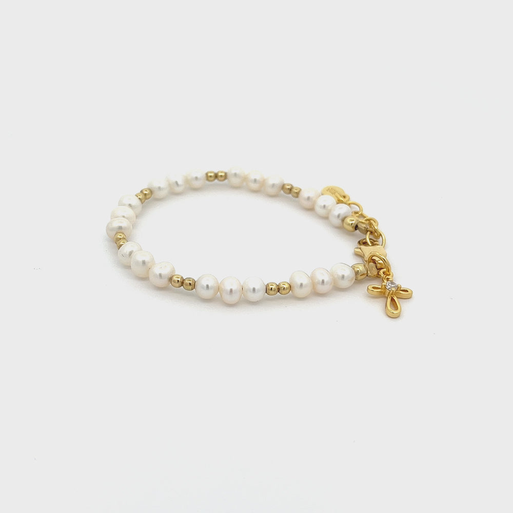 14K Gold-Plated Simulated Pearl Bracelet with Cross for Baptism or First Communion