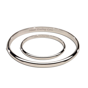 From our Timeless Collection this sterling silver bangle bracelet set makes a unique gift for mother and daughter or grandmother and granddaughter. These beautiful keepsakes are crafted with genuine .925 sterling silver and have the special sentiment "Never Ending Love" inscribed inside both bracelets. A truly timeless keepsake and sweet message between a mother and her daughter.