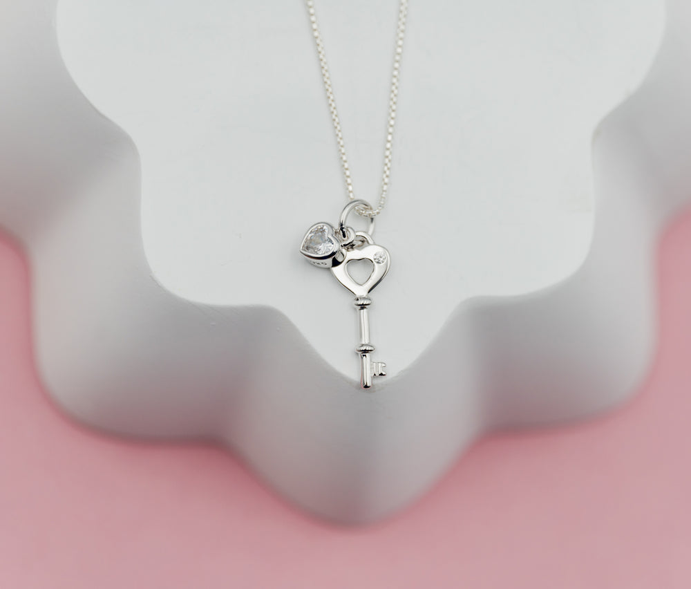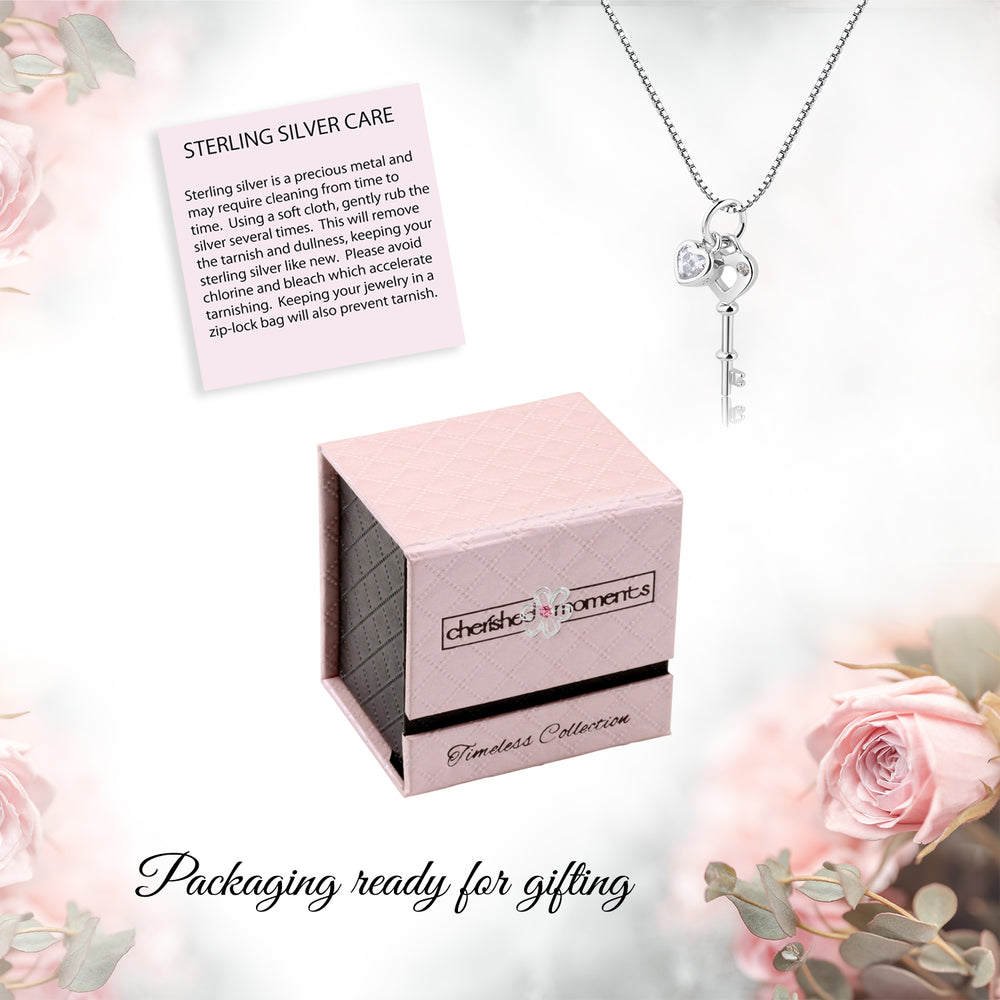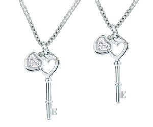 From our Timeless Collection this sterling silver mom and me "Key to Your Heart" necklace set makes a unique gift for mother and daughter or grandmother and granddaughter.  This set includes (2) key charms with chains.  These beautiful keepsake key pendants are crafted with genuine .925 sterling silver and are accented with a sparkling CZ heart charm.  A truly timeless piece and sweet gift for a mother and her daughter.