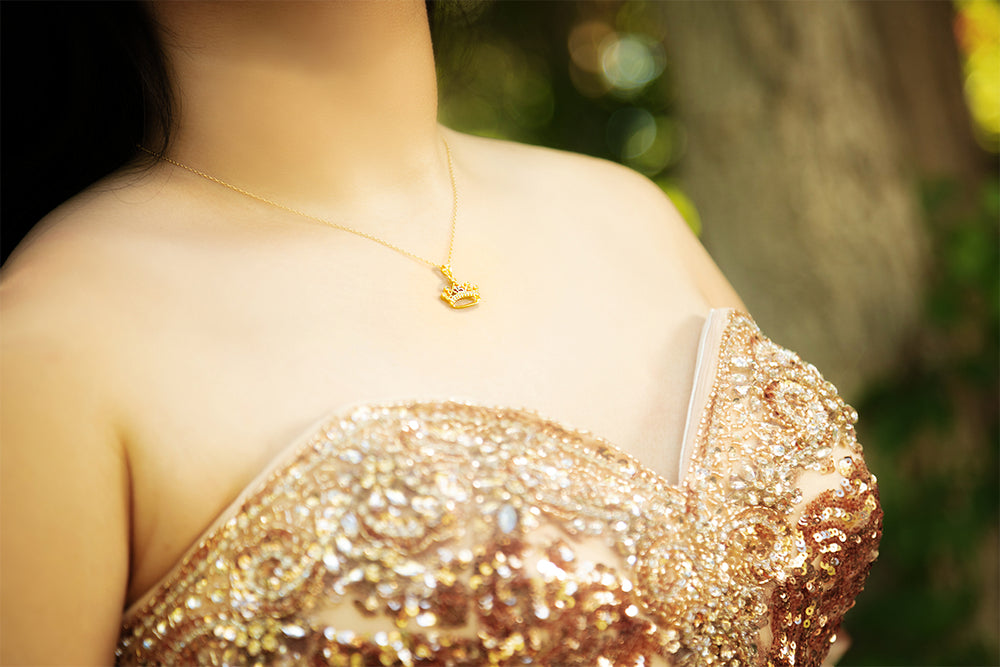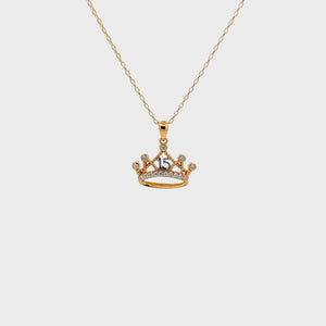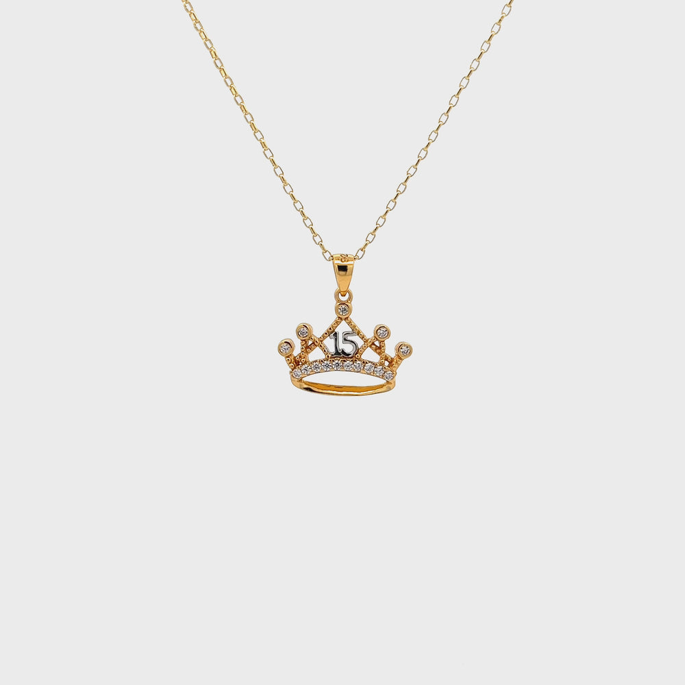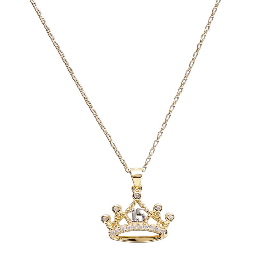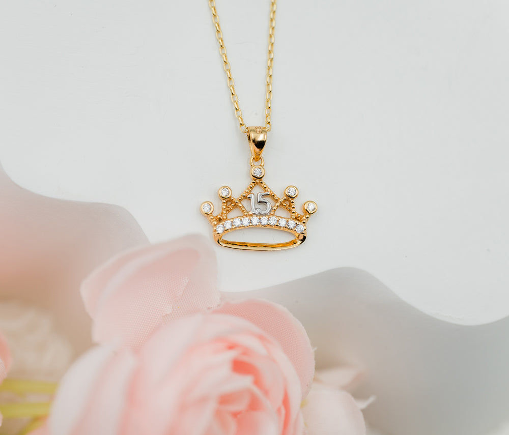 Sterling silver Quinceanera necklace for girls with a beautiful tiara pendant and is part of our Timeless Collection. This charm is special and represents her 15 years with a stone for each year on the pendant. Designed with sterling silver base with 14K Gold-Plating and a sterling silver "15". This pendant floats on an 18 inch rolo chain. High quality keepsake necklace comes with a sweet poem and special gift box to save her timeless gift.