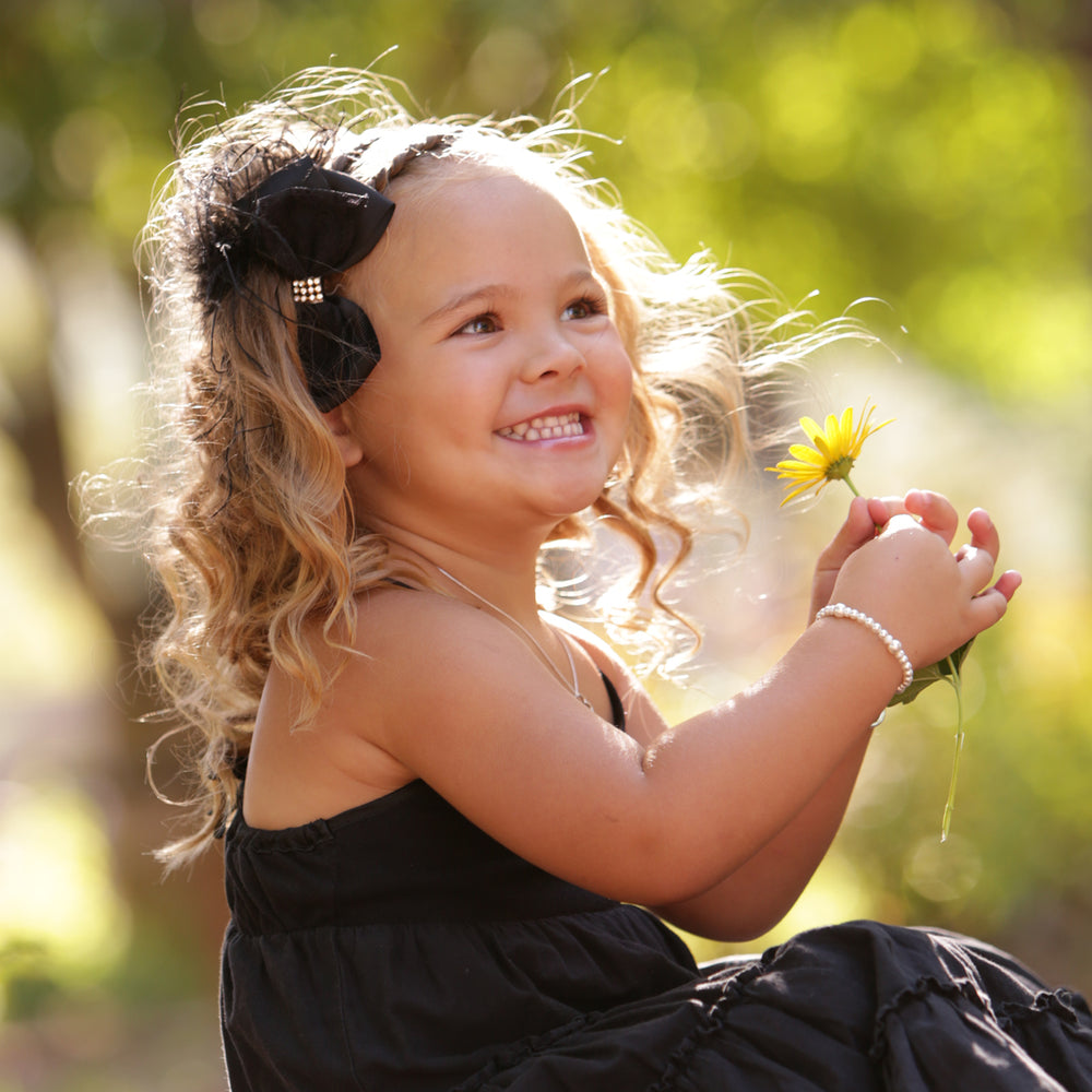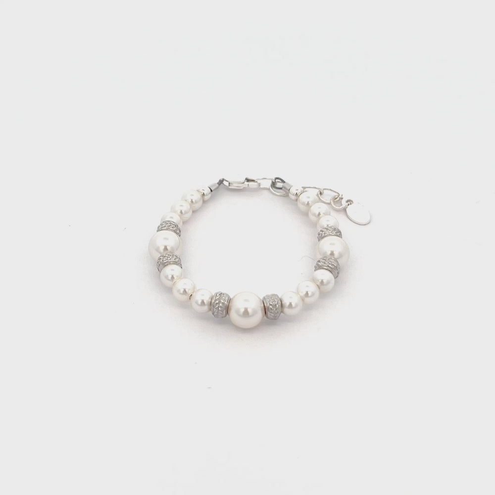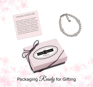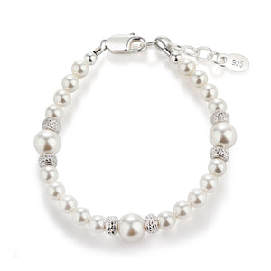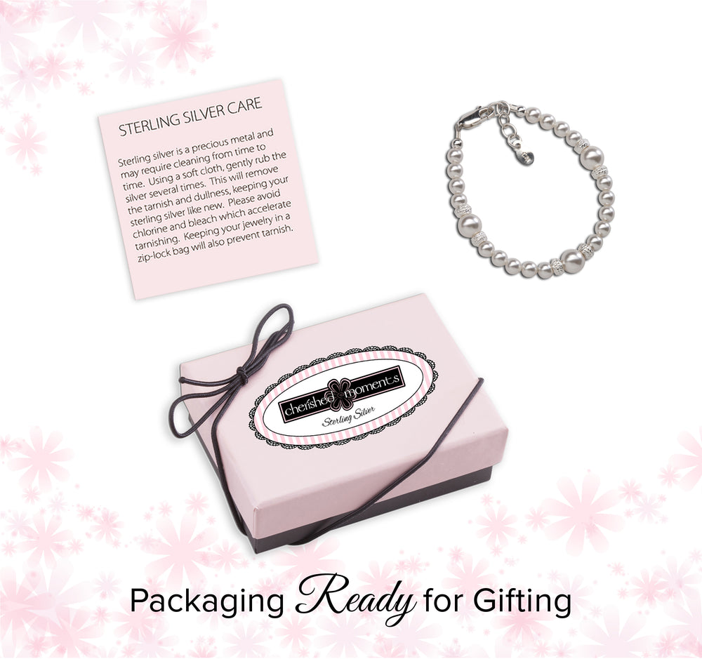 Sterling silver bracelet featuring beautiful high-end simulated pearls with sparkling silver stardust accents. This looks beautiful for flower girls or Jr. Bridesmaid and is a timeless keepsake that makes a perfect baby gift, flower girl gift, or her first pearls! Each bracelet has an extension chain, so as the child grows you just move to the next link for a perfect fit.  This bracelet is available in three sizes and is great for infants, babies, toddlers, and kids. This jewelry comes in a beautiful gift box and is hand made in the USA!  Celebrate these cherished moments with this keepsake she will treasure forever.