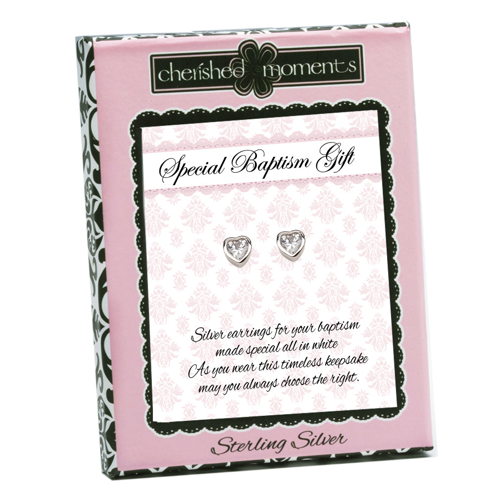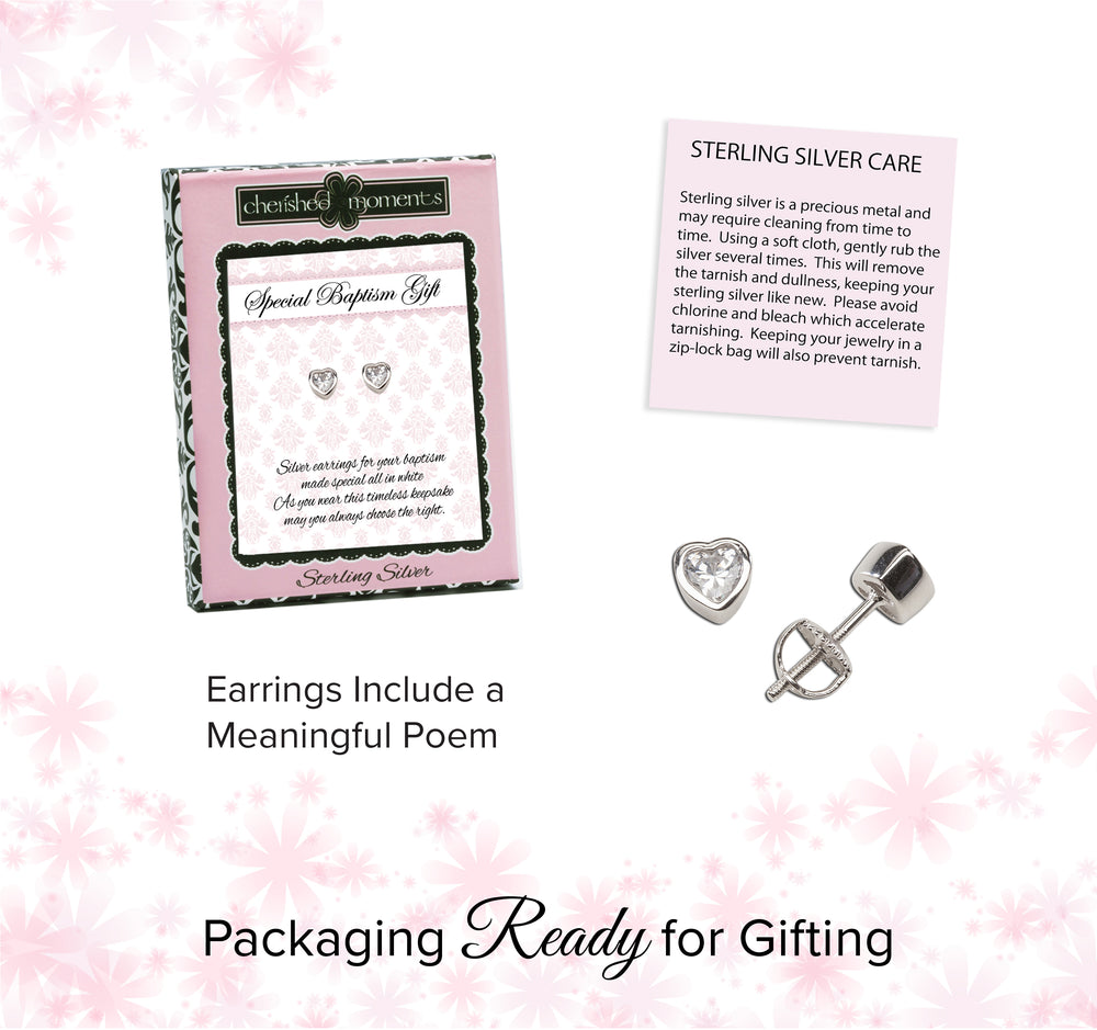 Sterling Silver Baptism CZ Heart Earrings