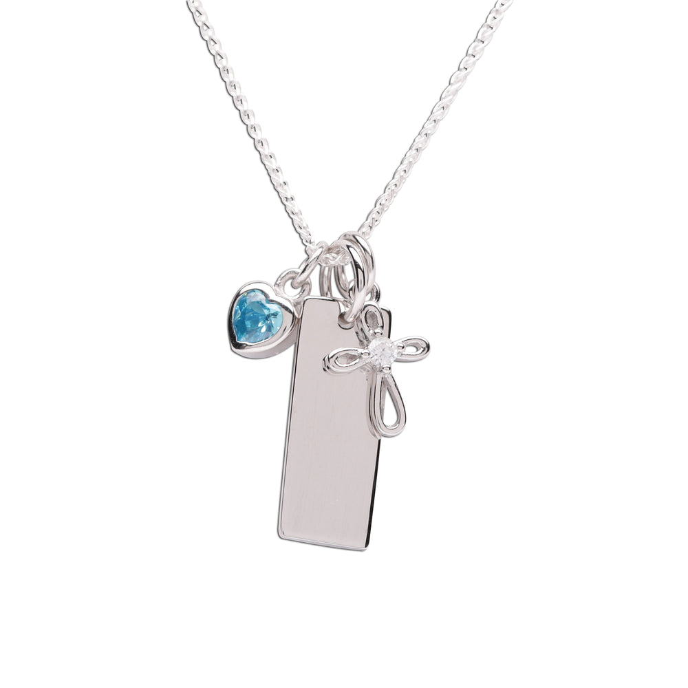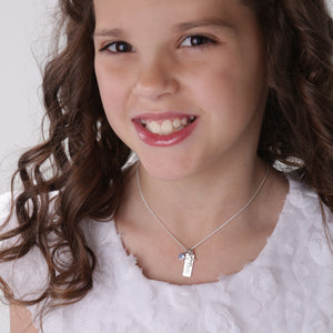 Sterling Silver Bar Necklace with Cross and CZ Birthstone Heart for Kids